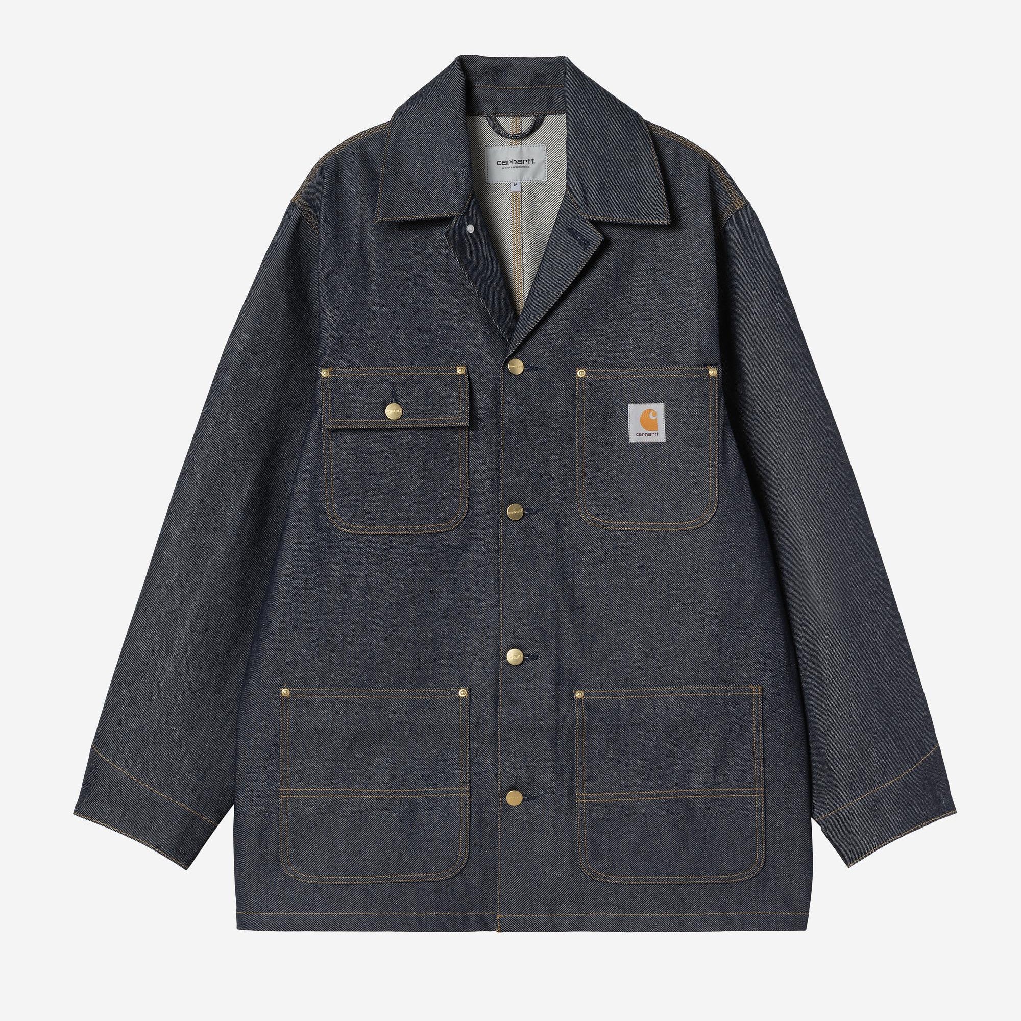 The Carhartt WIP Aden Chore Coat is made from heavyweight, recycled denim. Inspired by a classic chore coat silhouette, the style features four patch pockets on the front, one of which has a buttoned flap. Triple and bartack stitching offer additional durability. A woven Square Label completes the design.