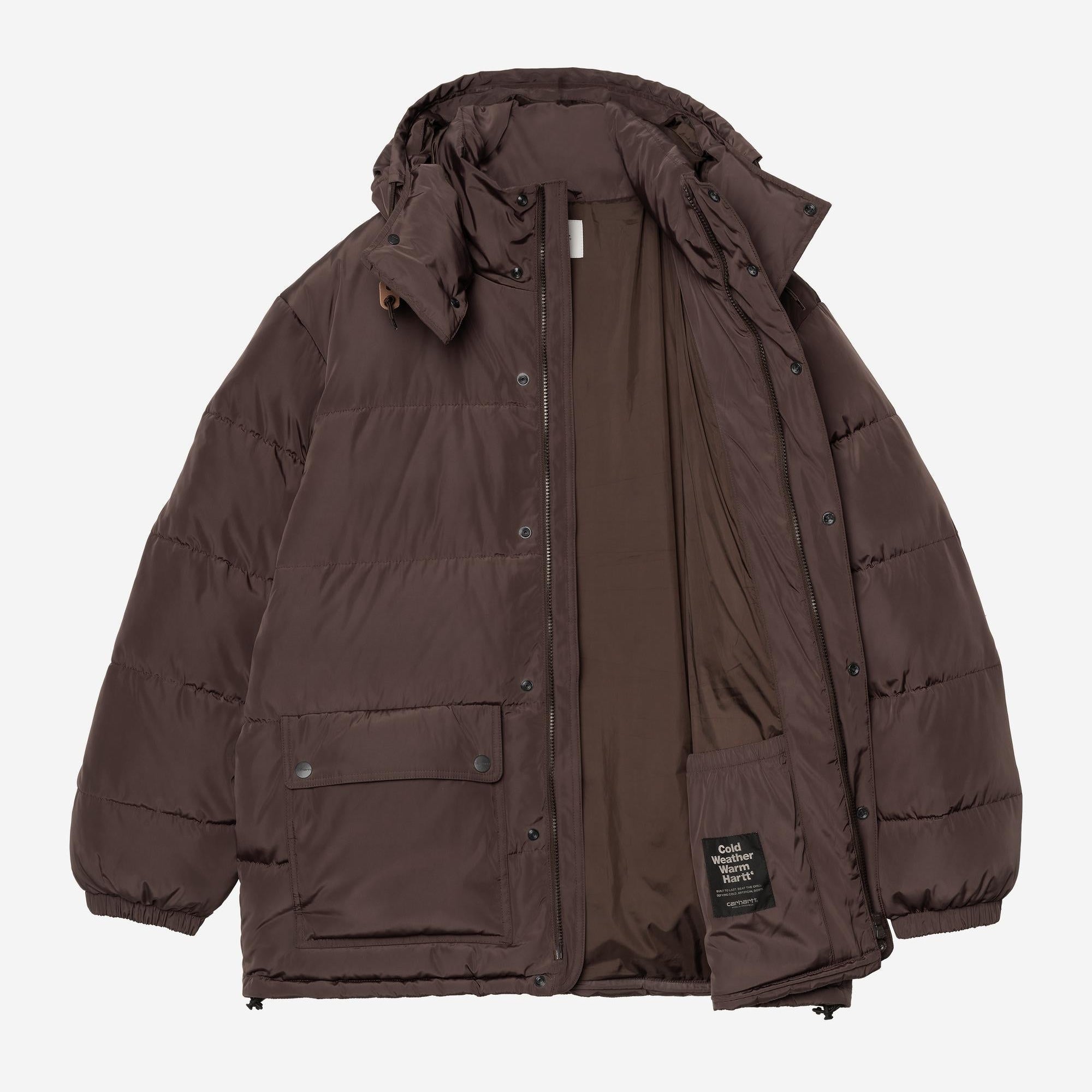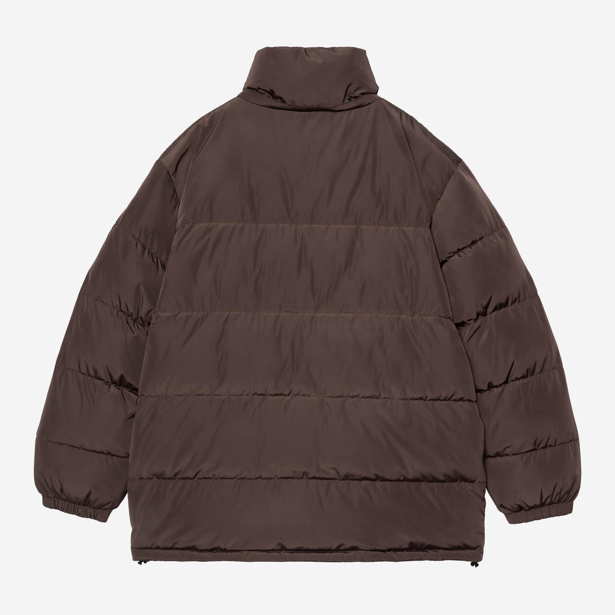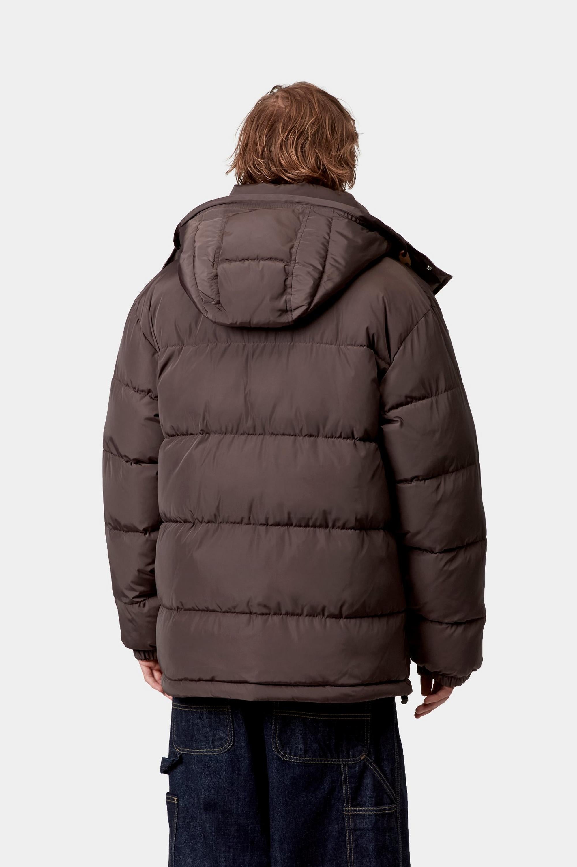 The Carhartt WIP Brent Jacket is made from lightweight polyester fabric and is padded with artificial down. It also features an adjustable and removable hood. Two patch pockets appear on the front. A woven Square Label completes the design.