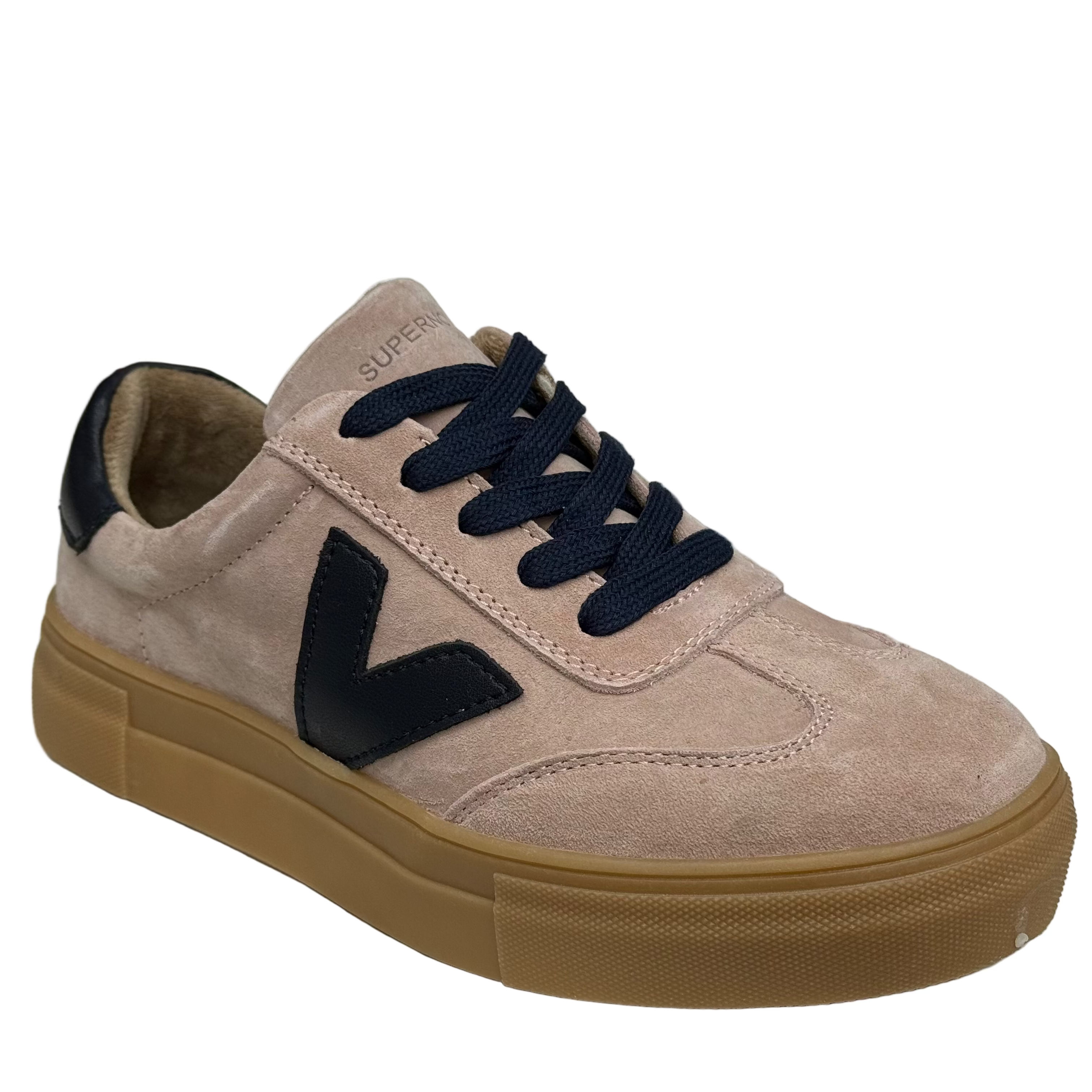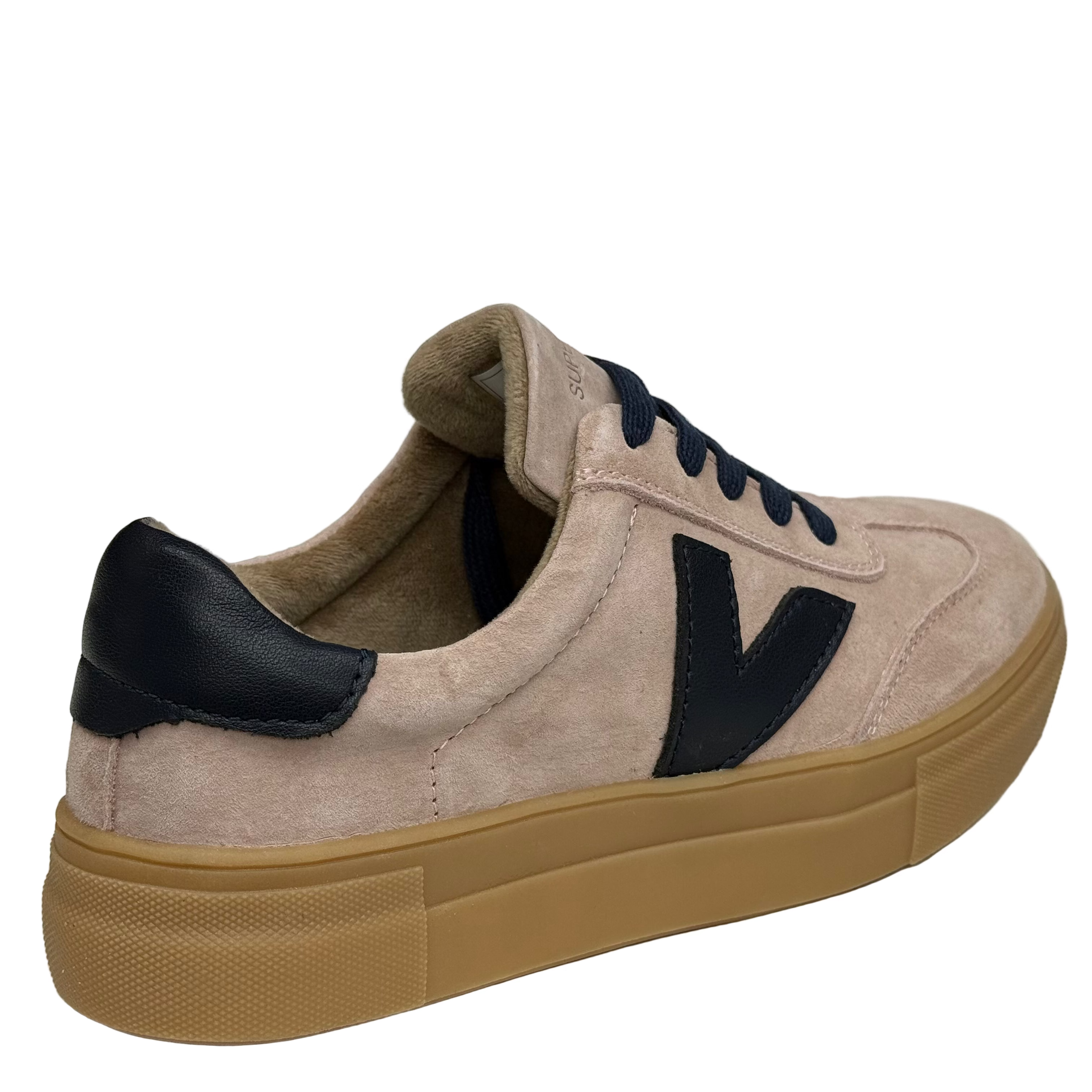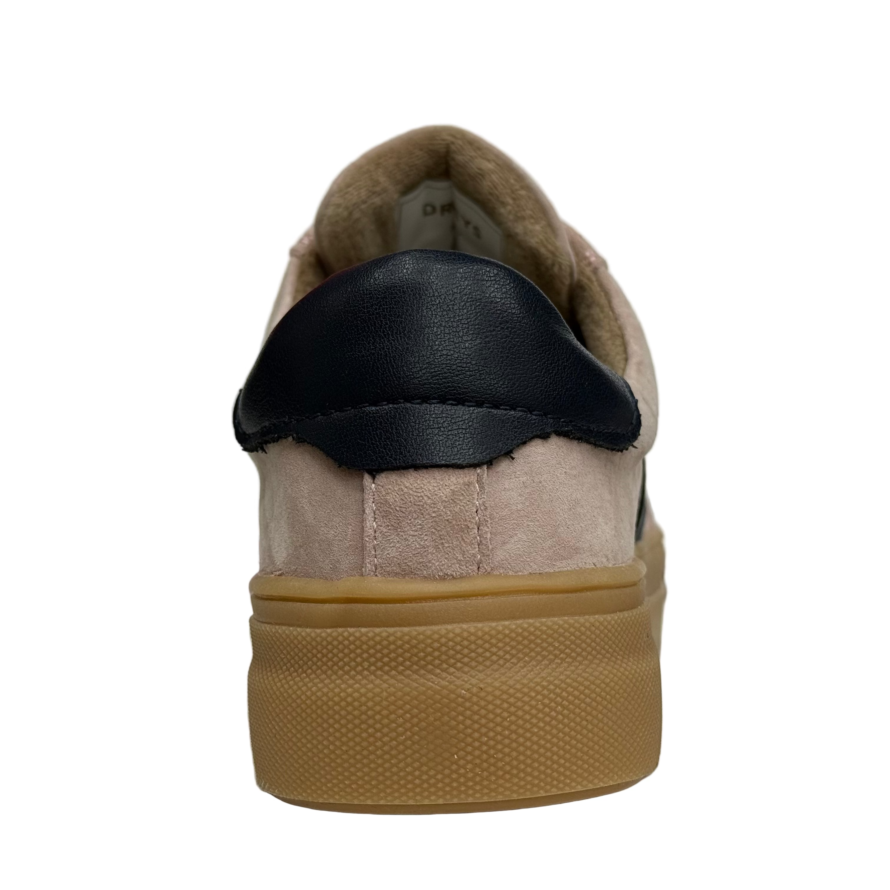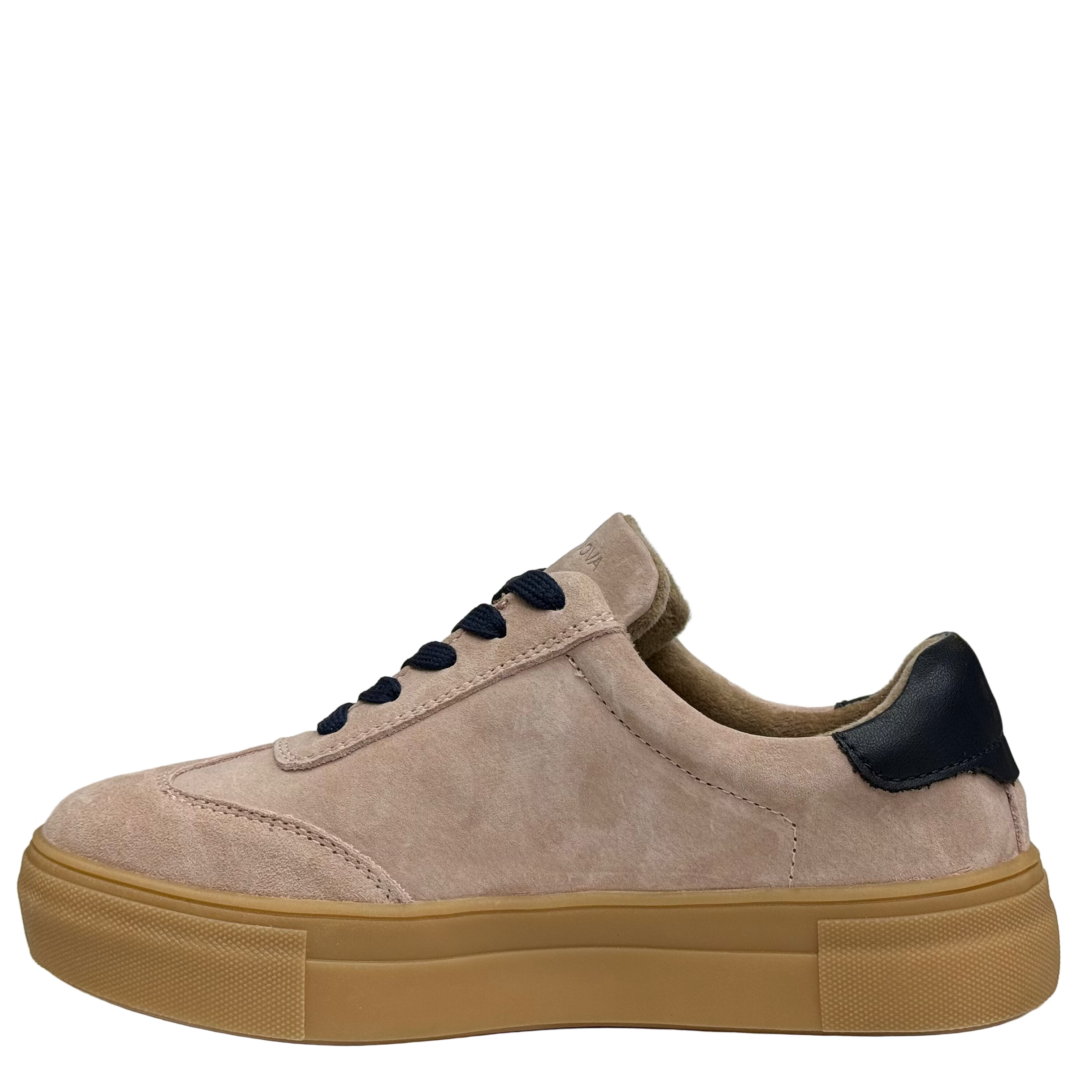 Drilleys Womens Ninety Trainers in Dusky Blue. Faux suede leather upper in pale pink with dark navy accent detailing. Gum sole.
