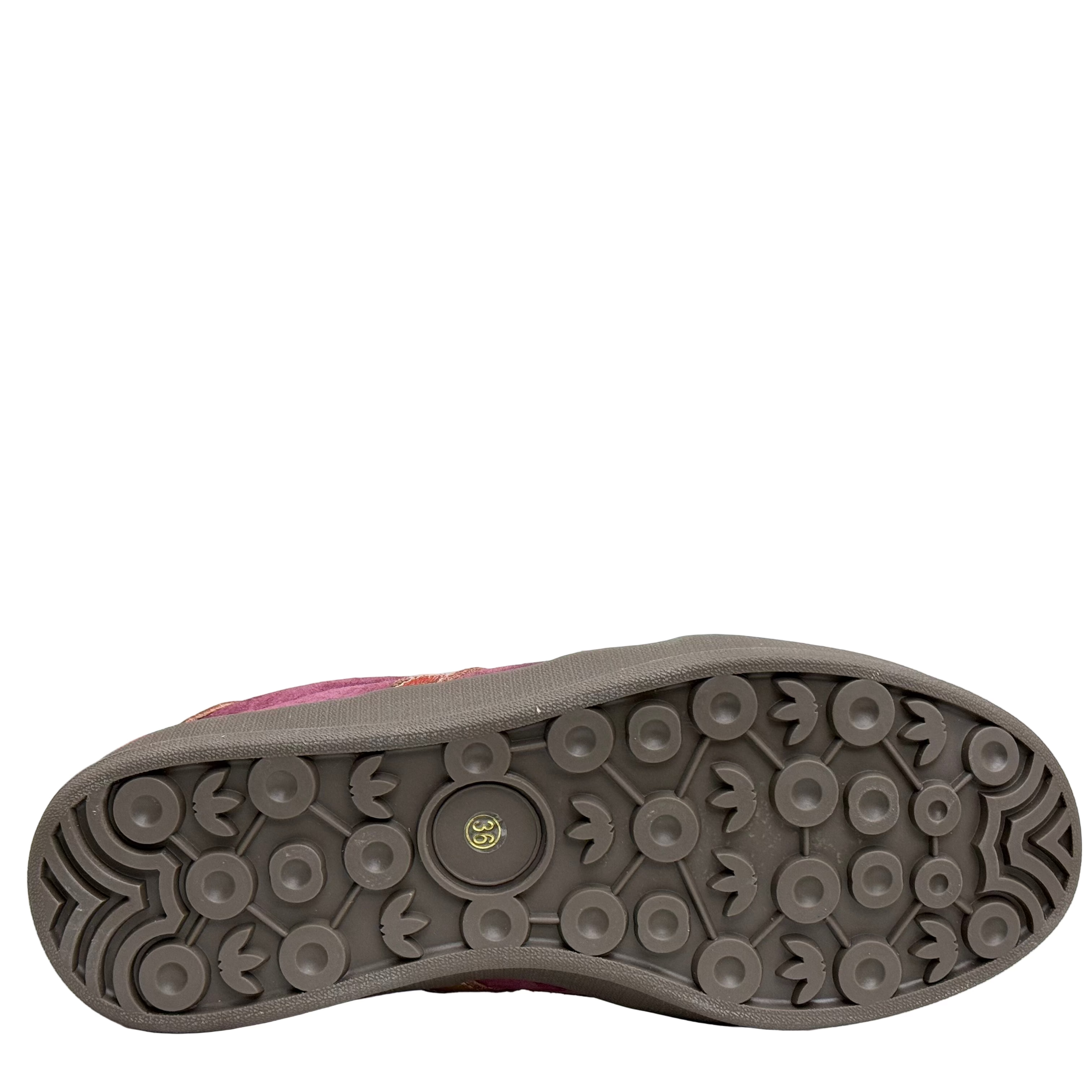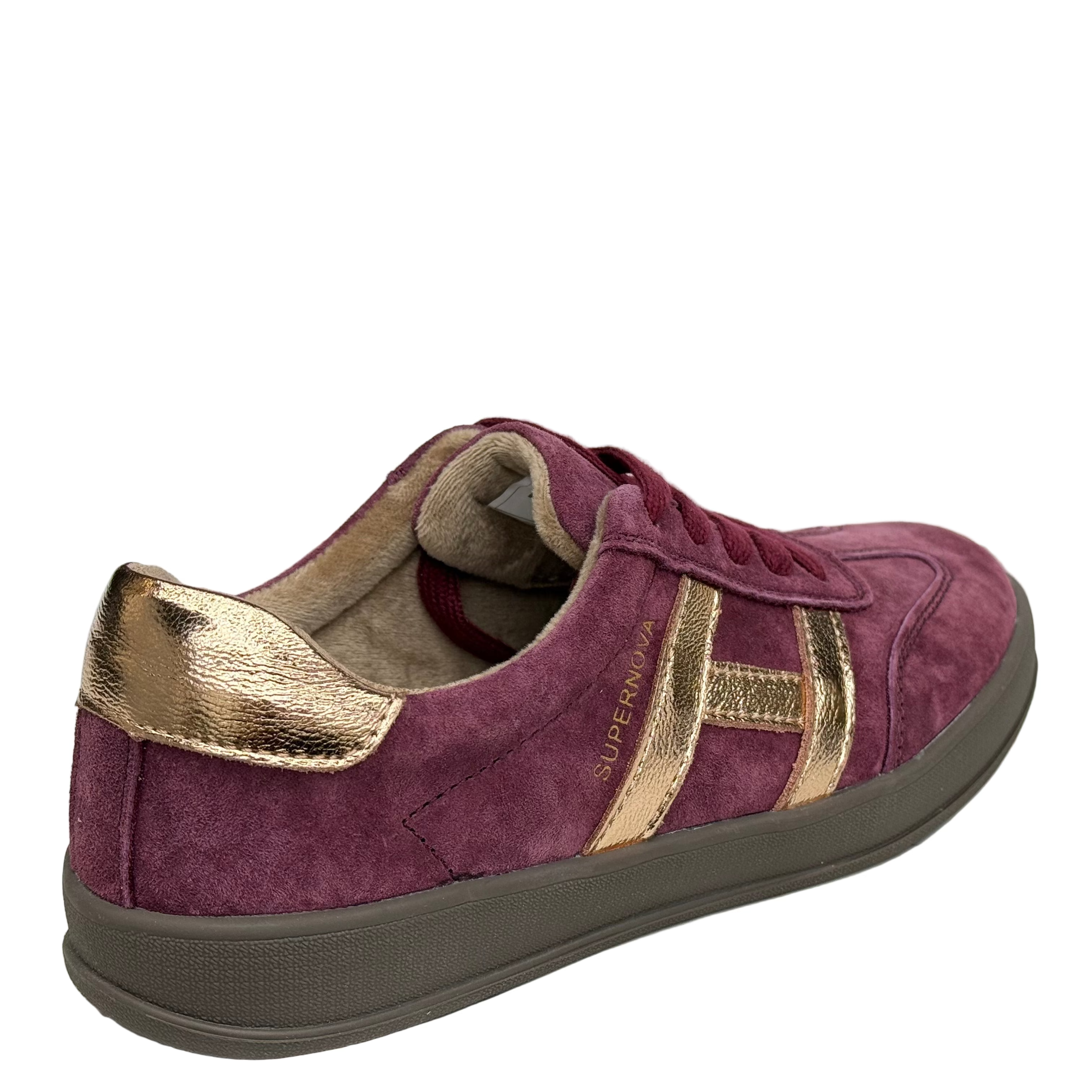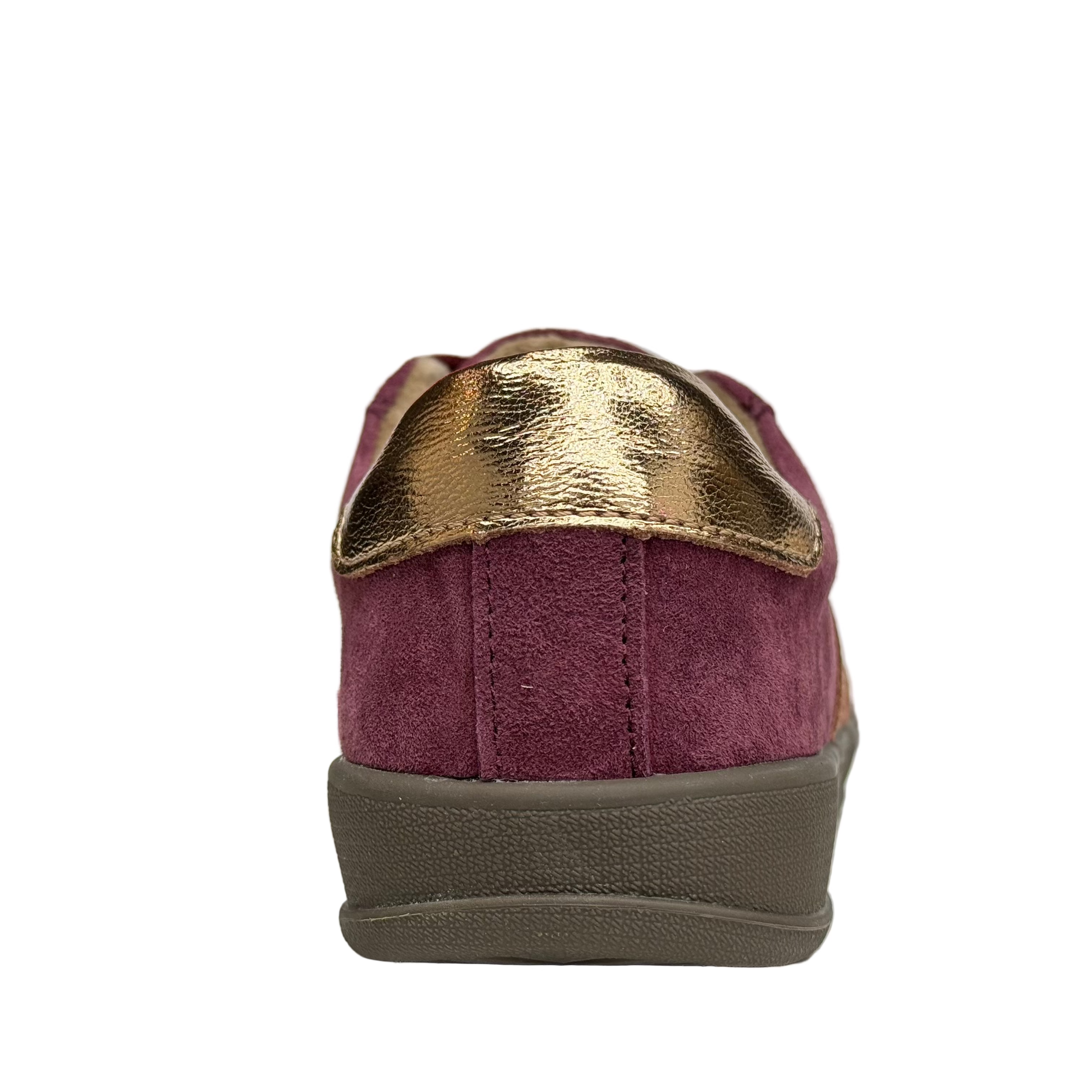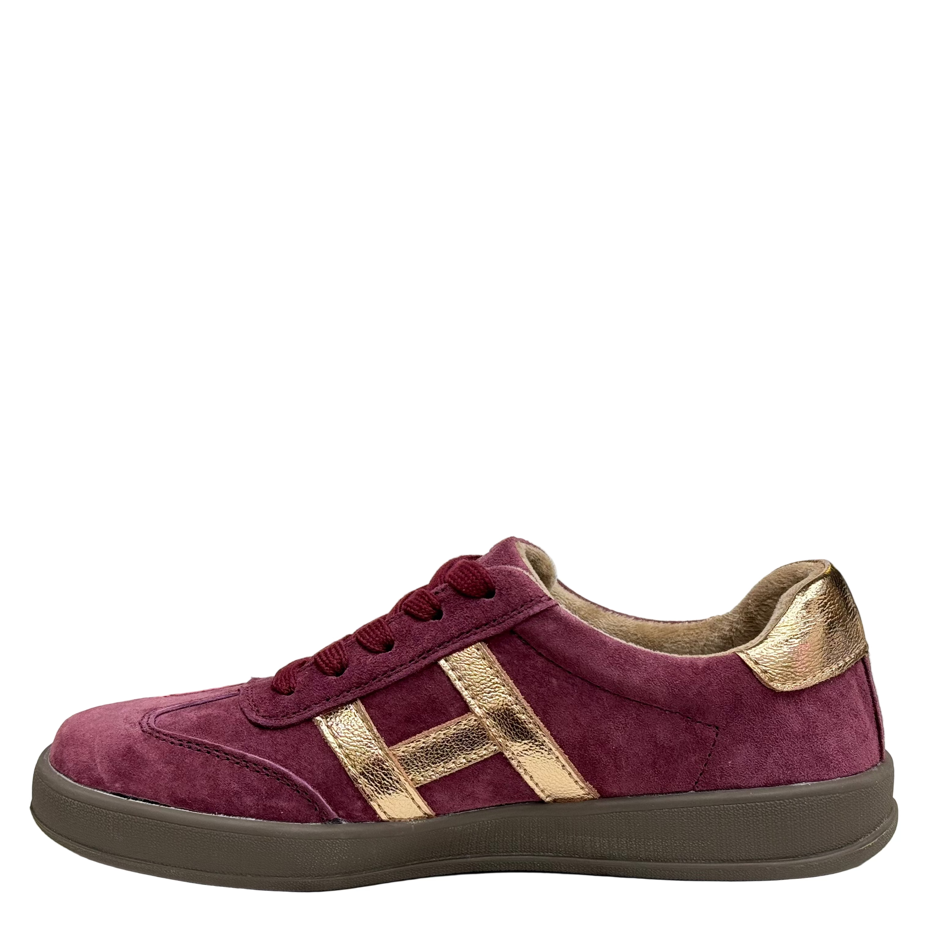 Drilleys Womens Sixty One Trainers in Jazzberry Red. Faux suede leather upper in maroon red with metallic gold accent detailing. Gum sole.