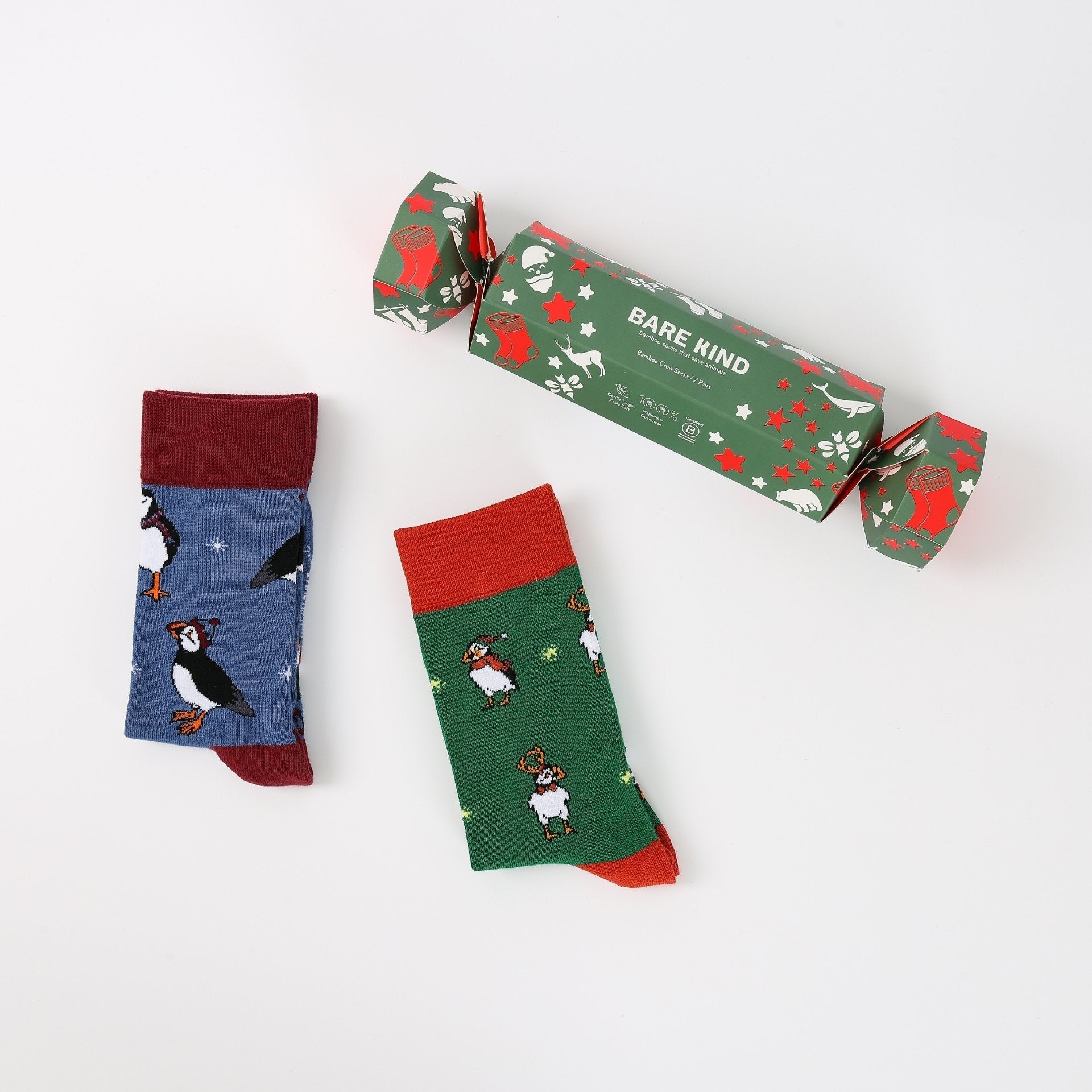 Bare Kind Christmas Cracker Blue Puffin & Green Puffin Bamboo Socks | 2 Pack