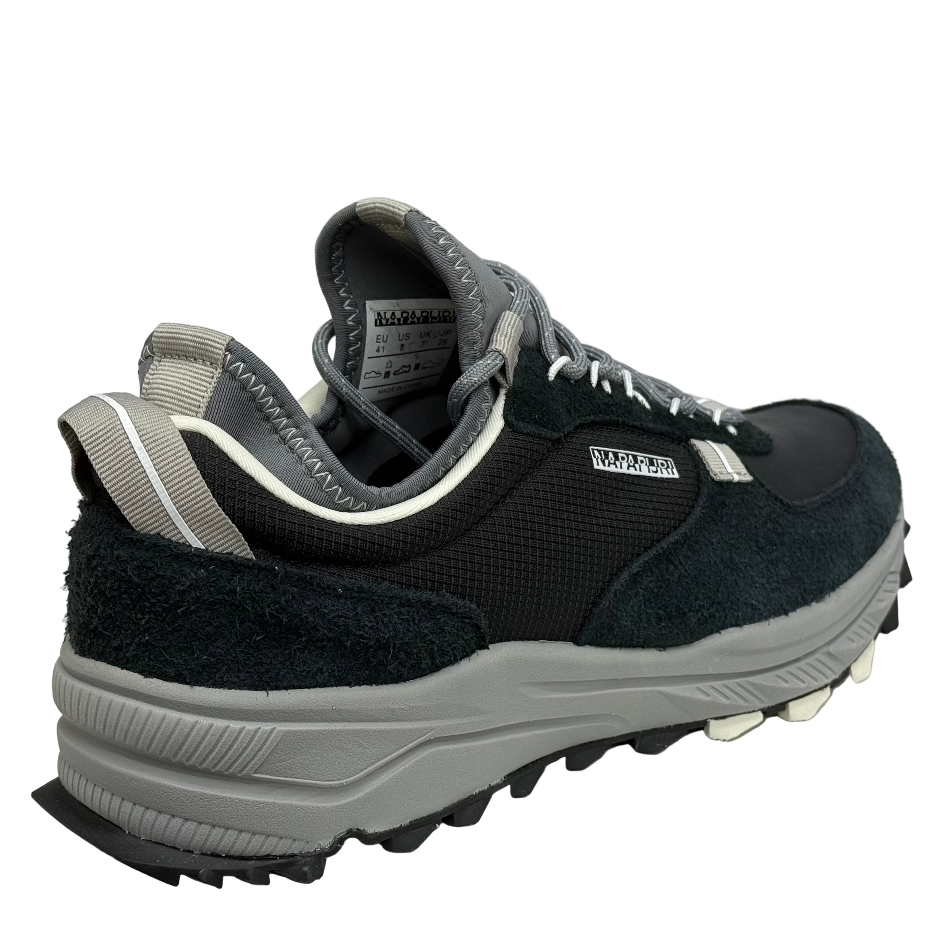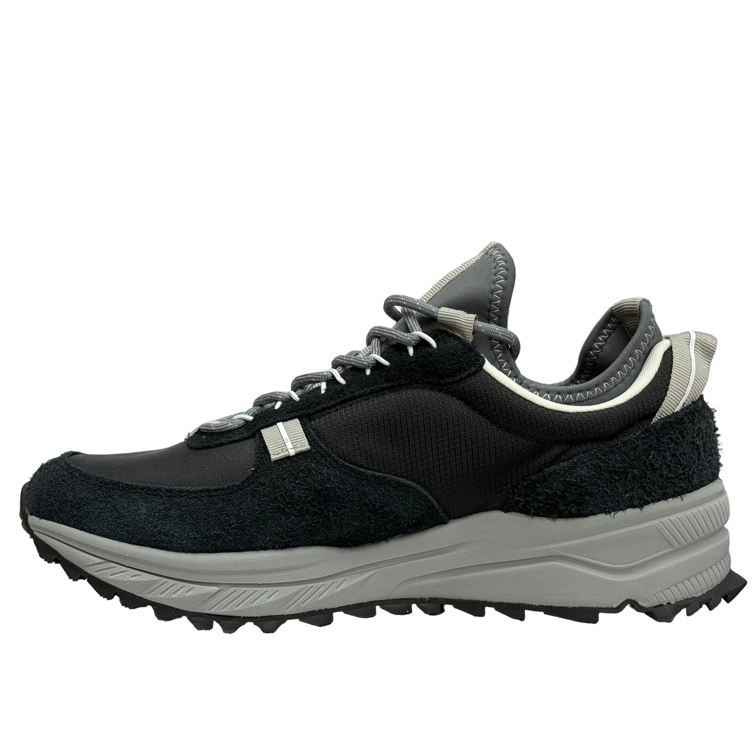 Trail-inspired sneakers with an urban attitude. Built with a durable upper in technical fabric and black suede, they feature a sock-like construction for easy, comfortable wear. Contrasting grey accents on the laces and heel add a refined touch, while the two-tone raised sole with a rugged tread delivers comfort and grip—perfect for everyday use.