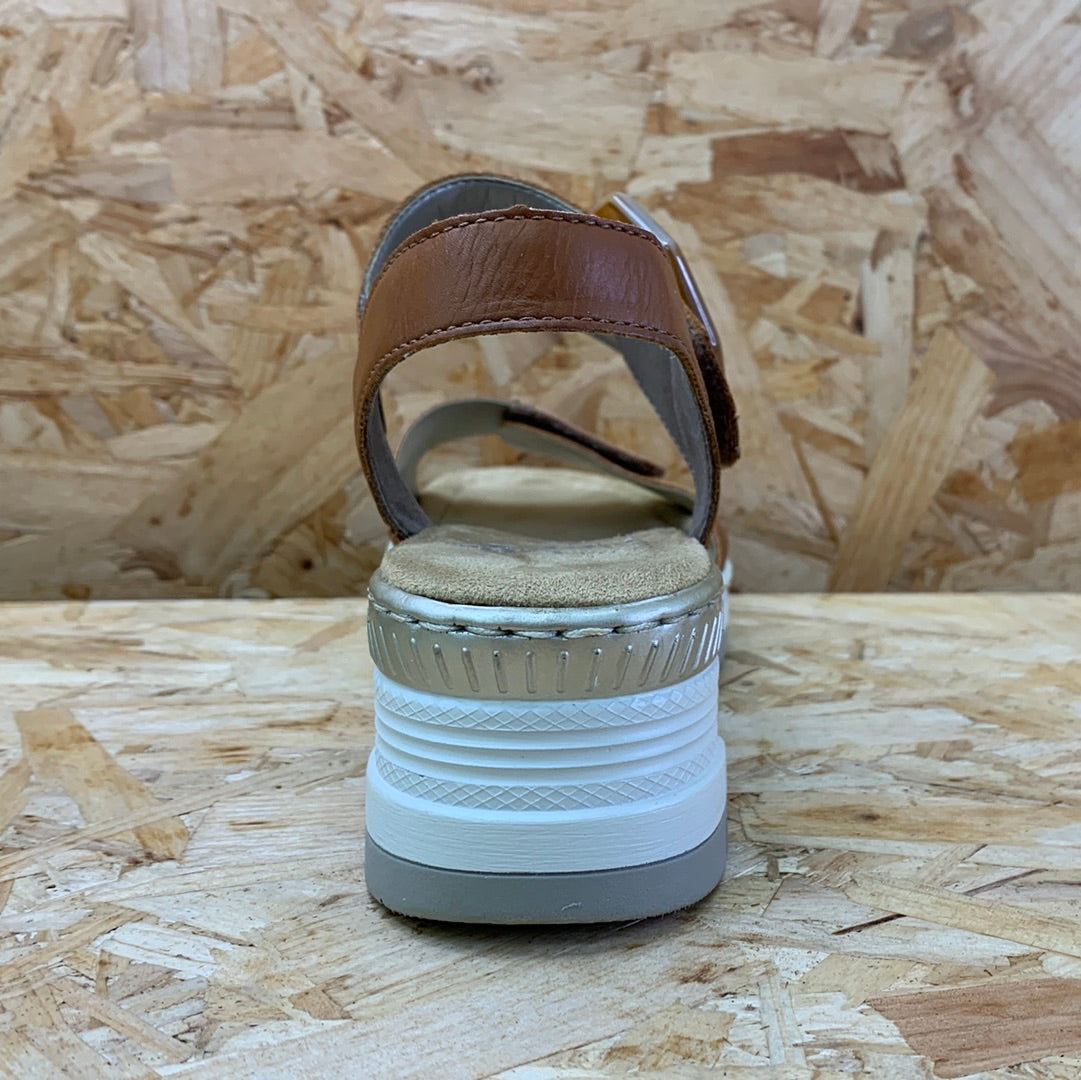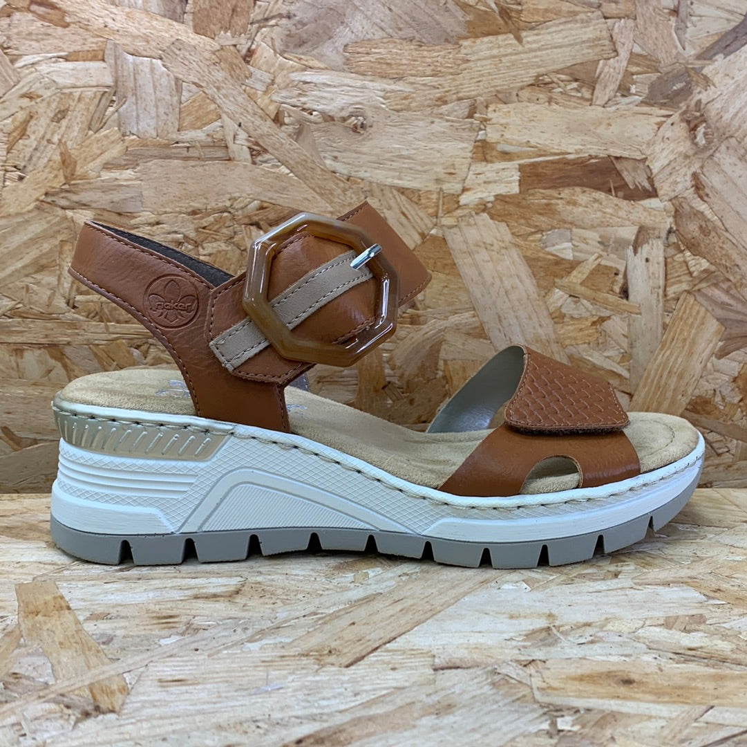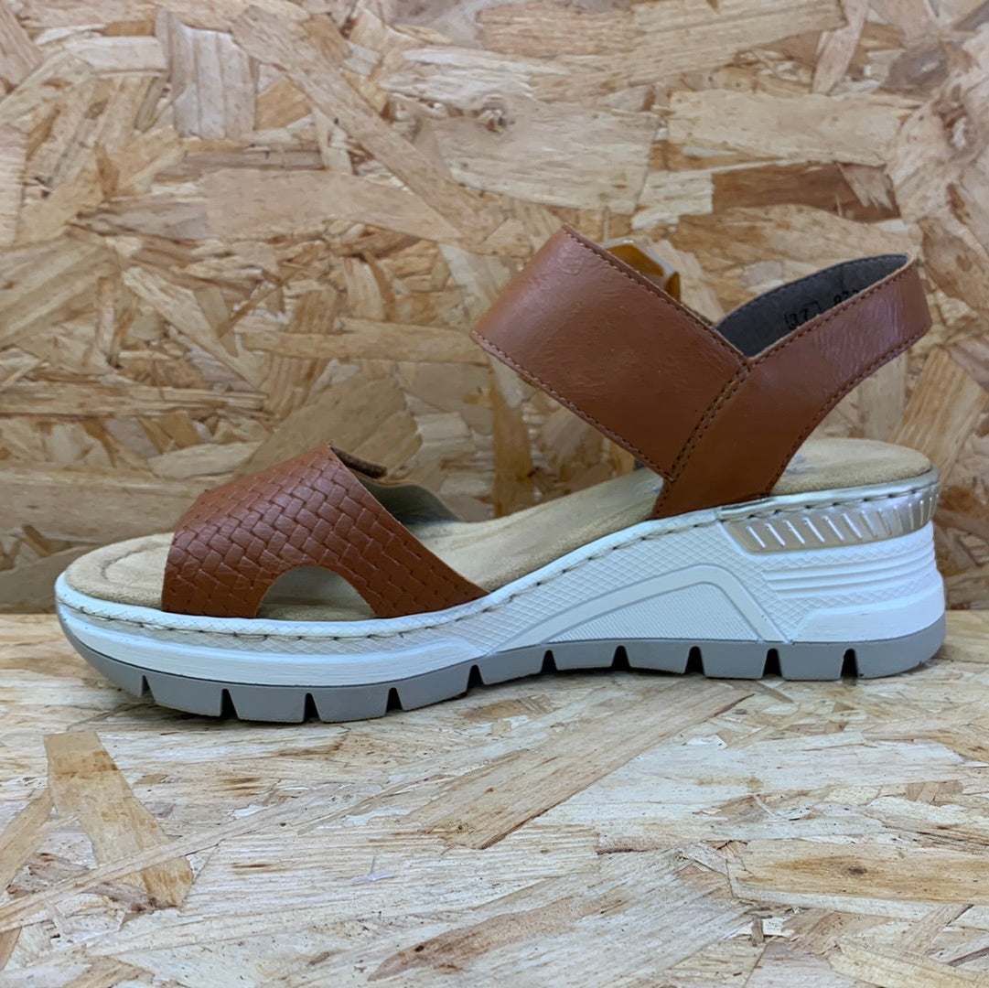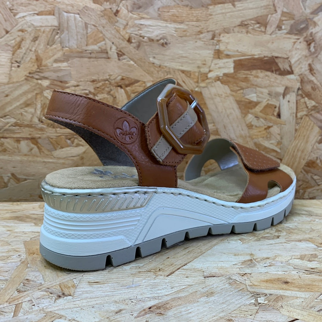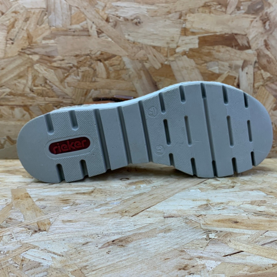 Rieker Womens Fashion Wedge Sandal in Brown. Faux buckle and fastened with hook and loop strap. Adjustable hook and loop strap across the front of foot with basket weave texturing . Chunky sports style sole. Lightweight.