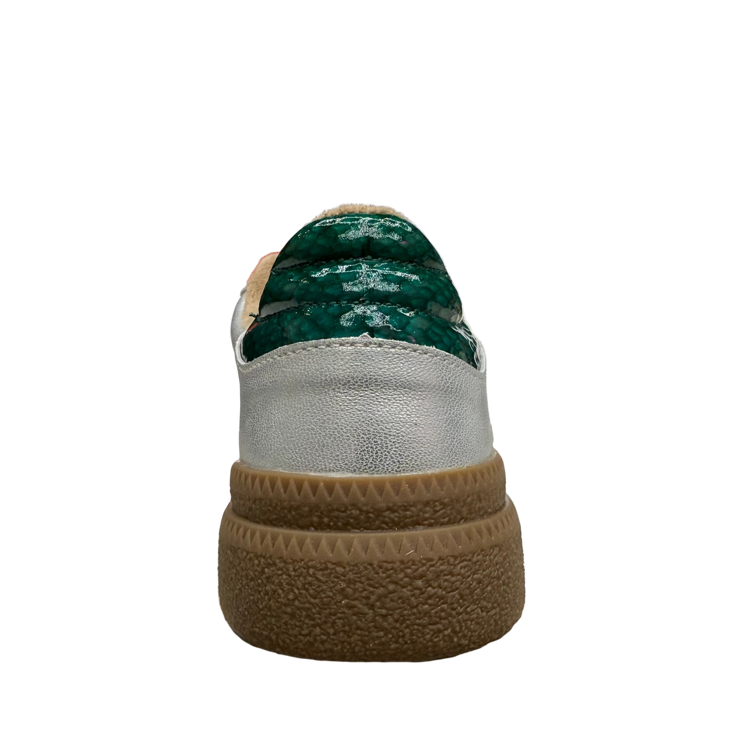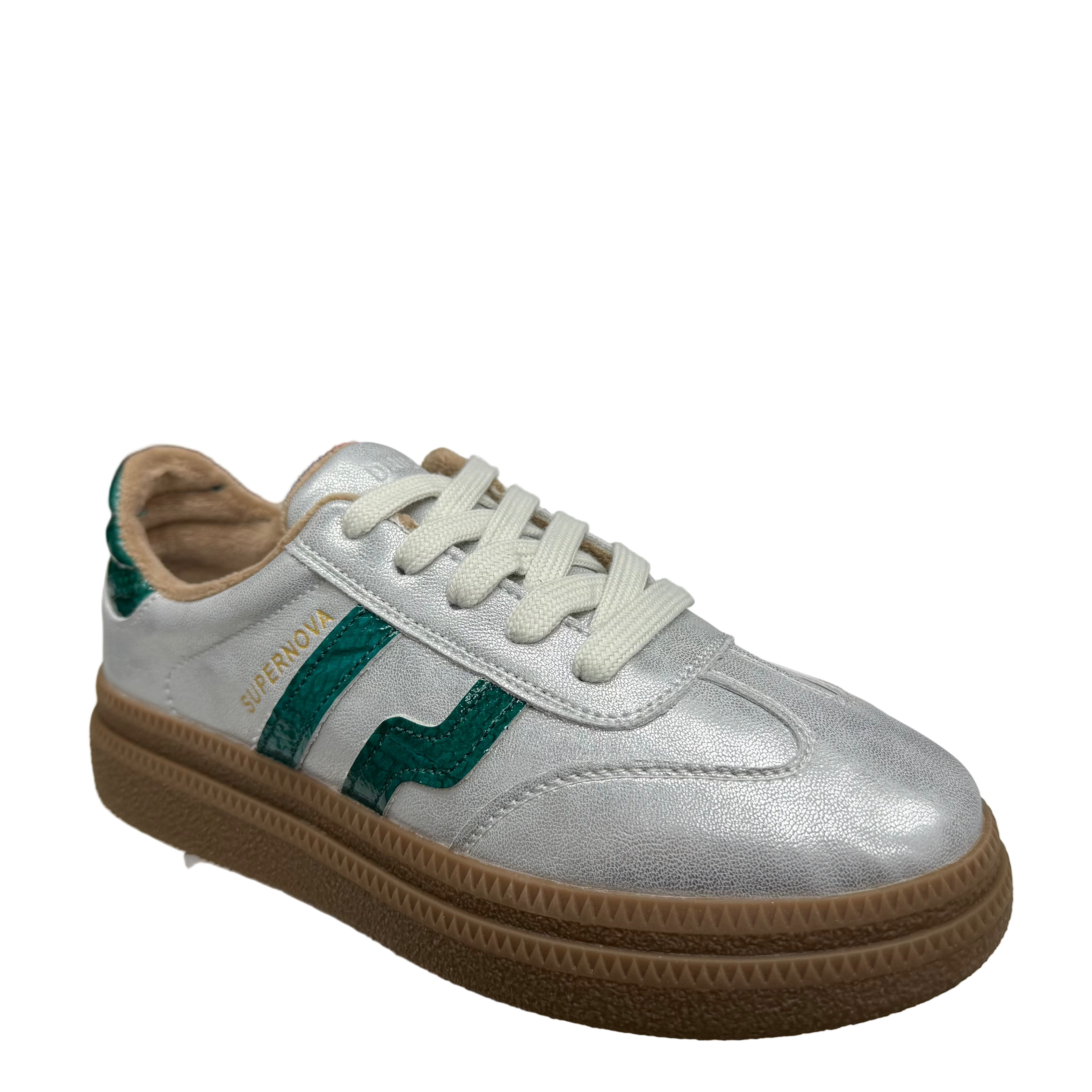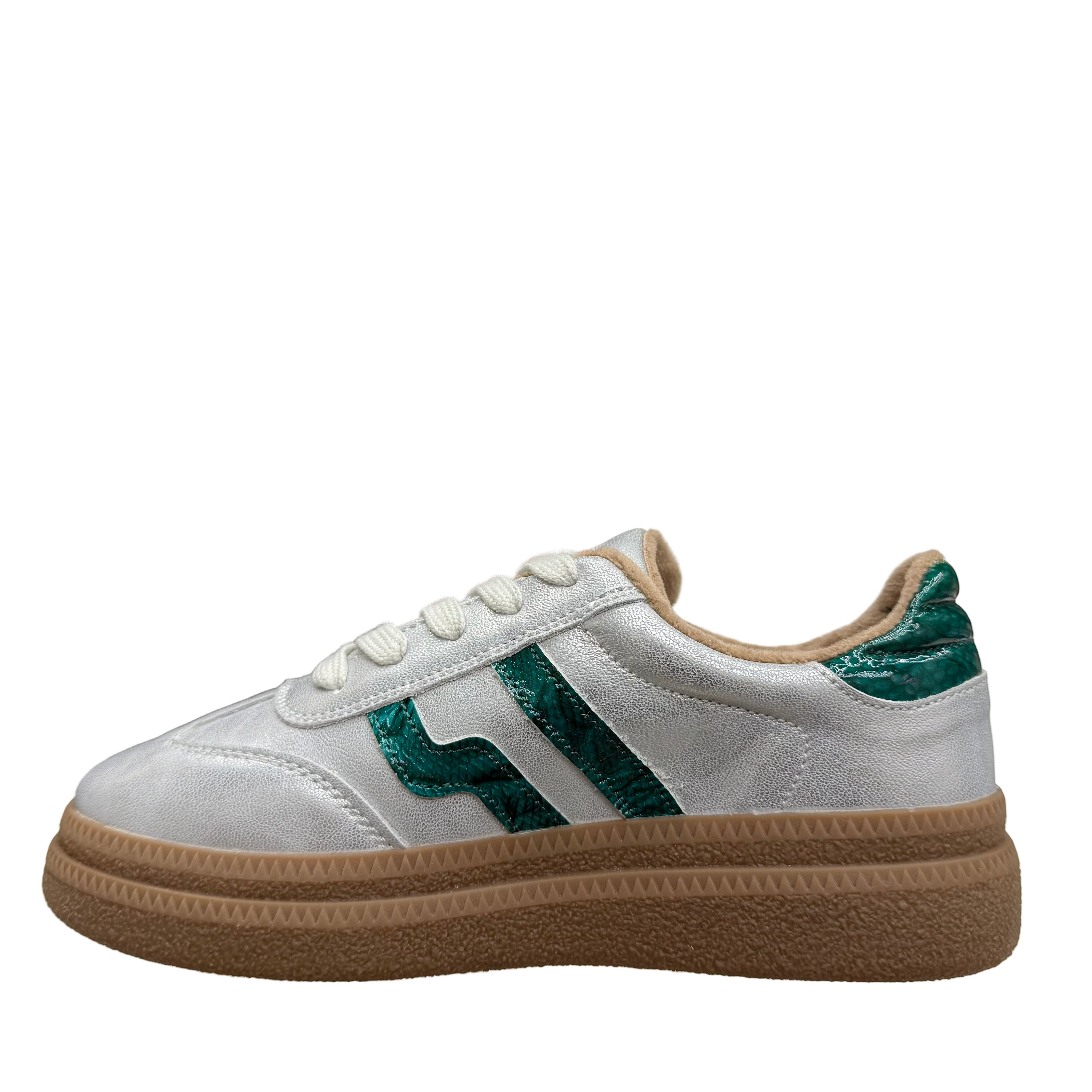 Drilleys Womens Eighty Two Trainers in Outerspace Grey. Faux suede leather upper in outer space grey with green accent detailing. Chunky gum sole.