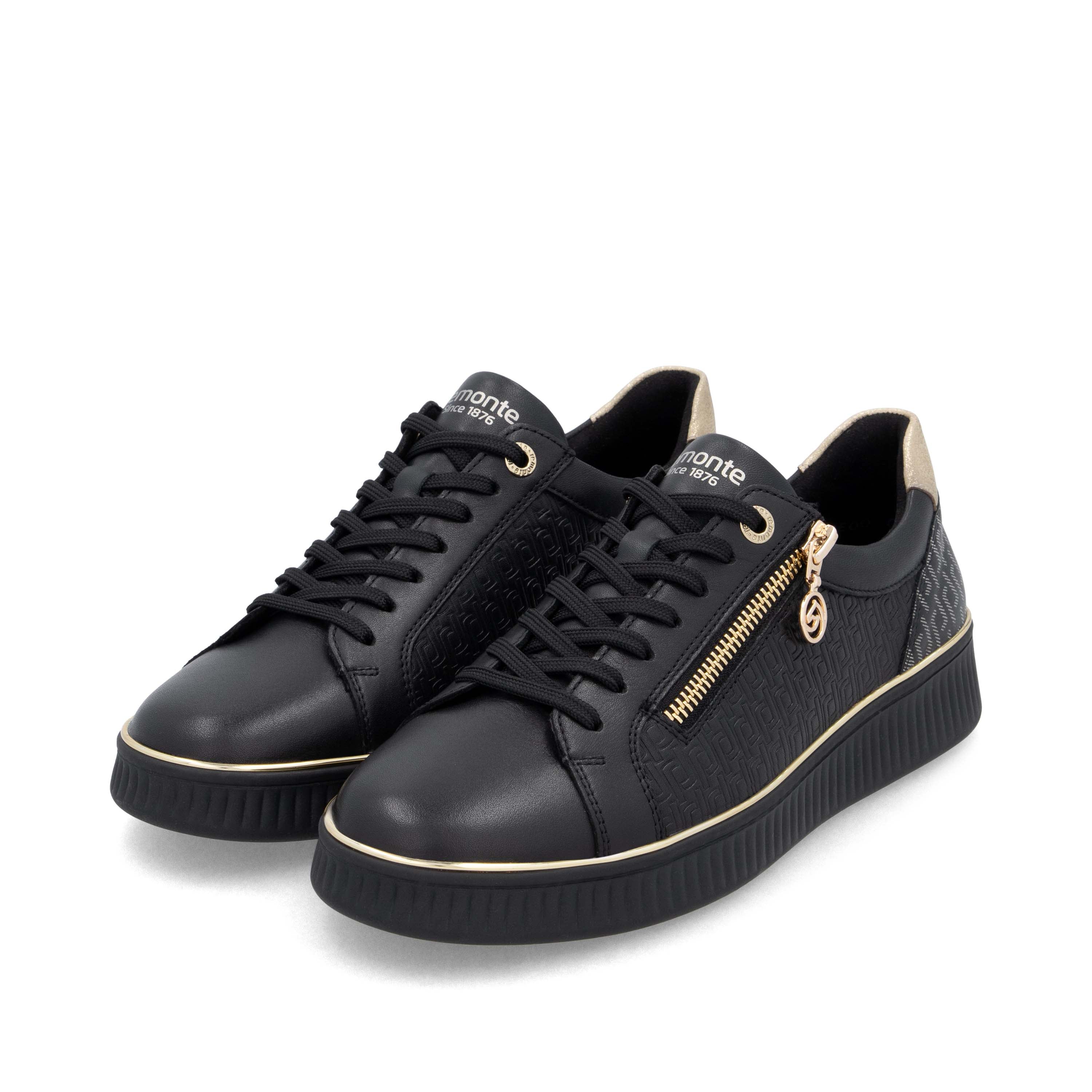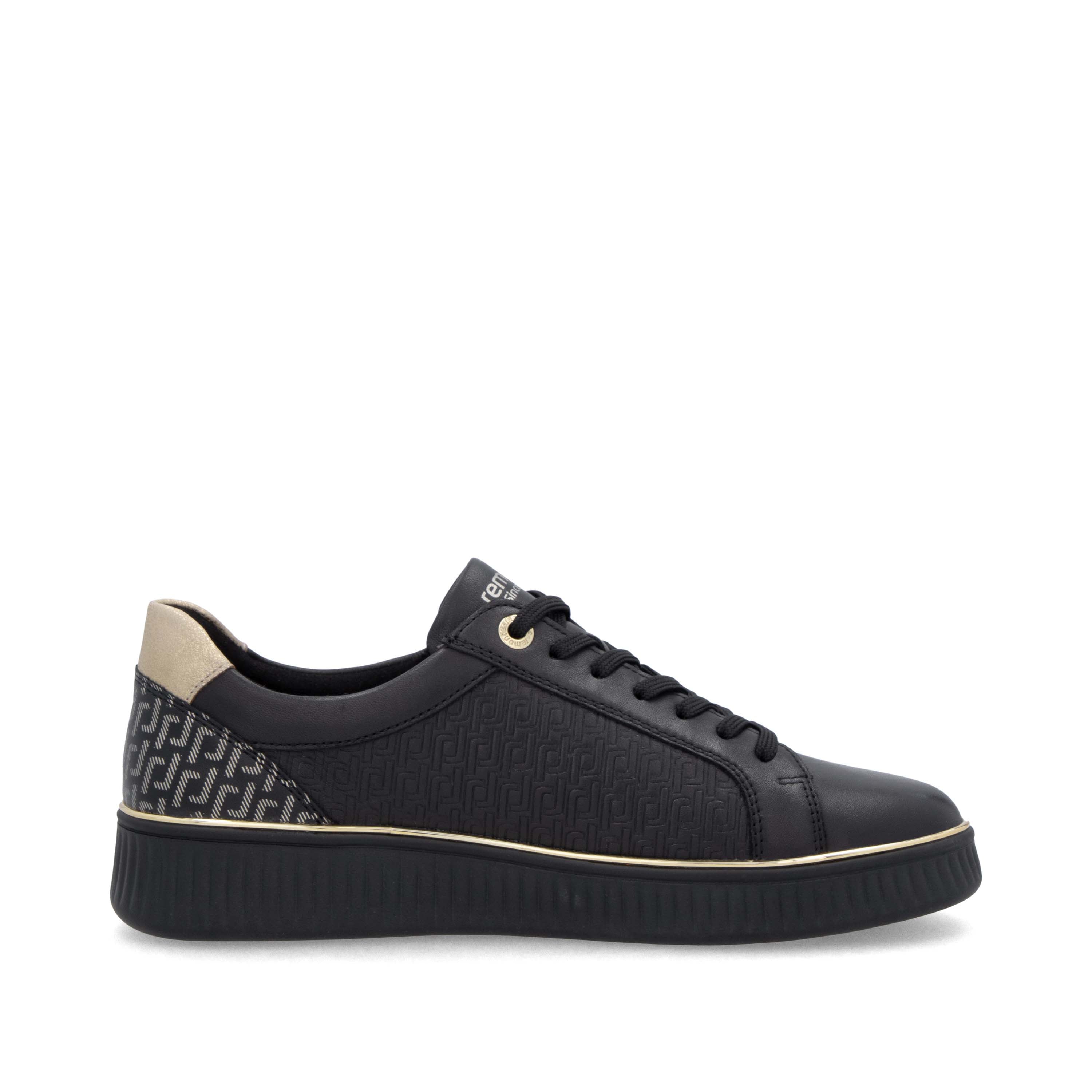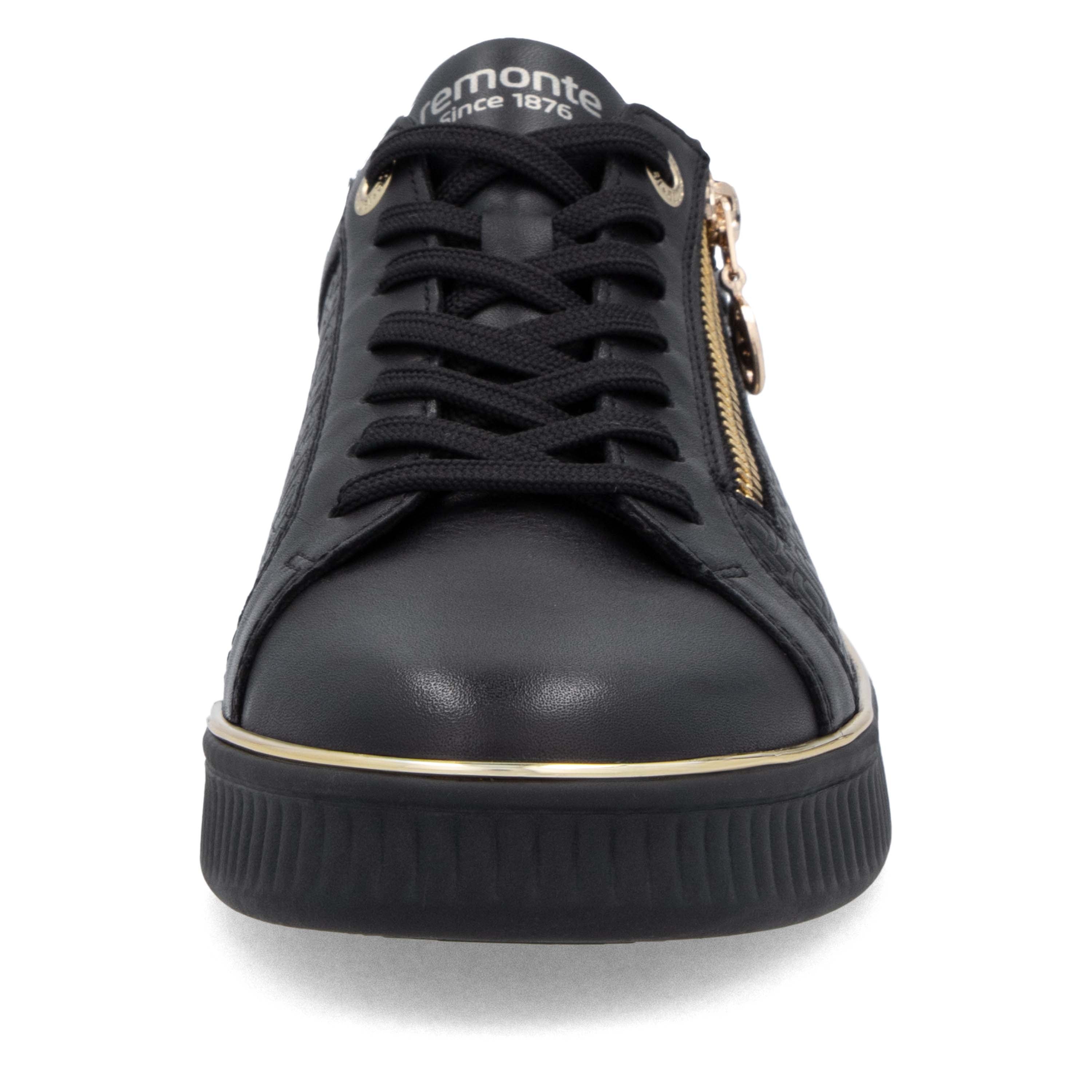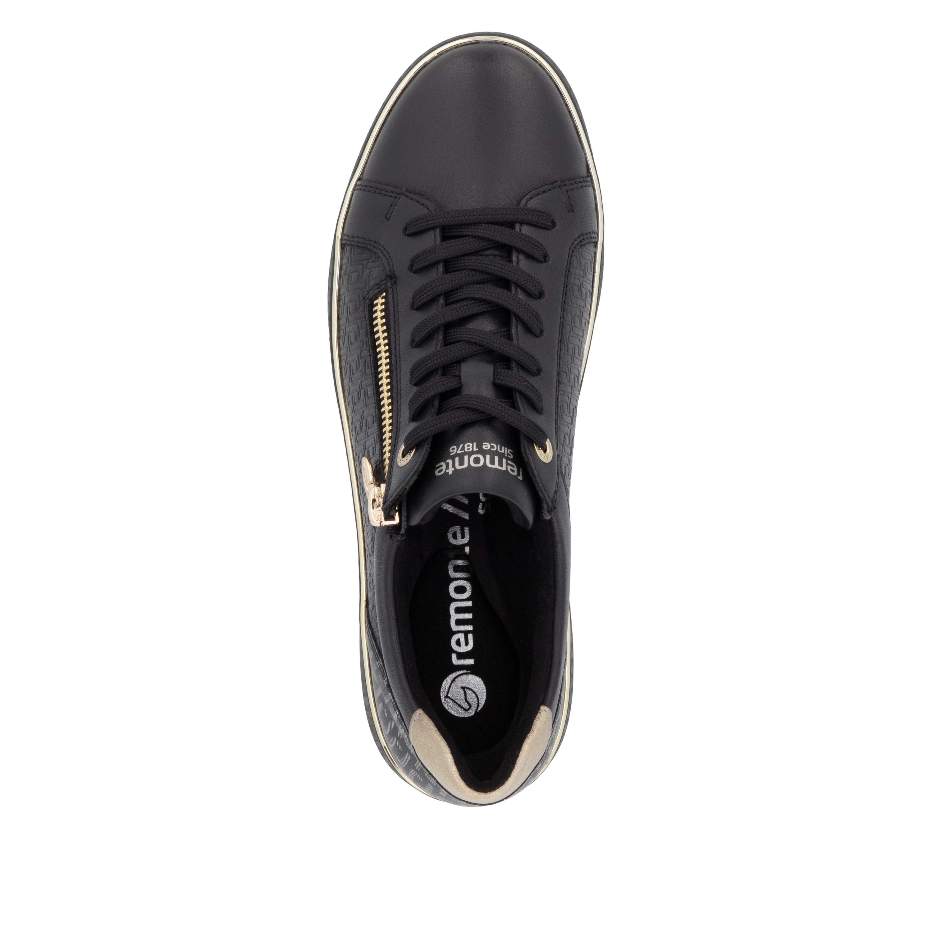 Remonte Womens Trainers in black leather upper with gold trim detailing. Lace up style with side zip for ease of foot entry. Soft cushioned insole. Removable Footbed. Breathable and soft inner material. Light and flexible.