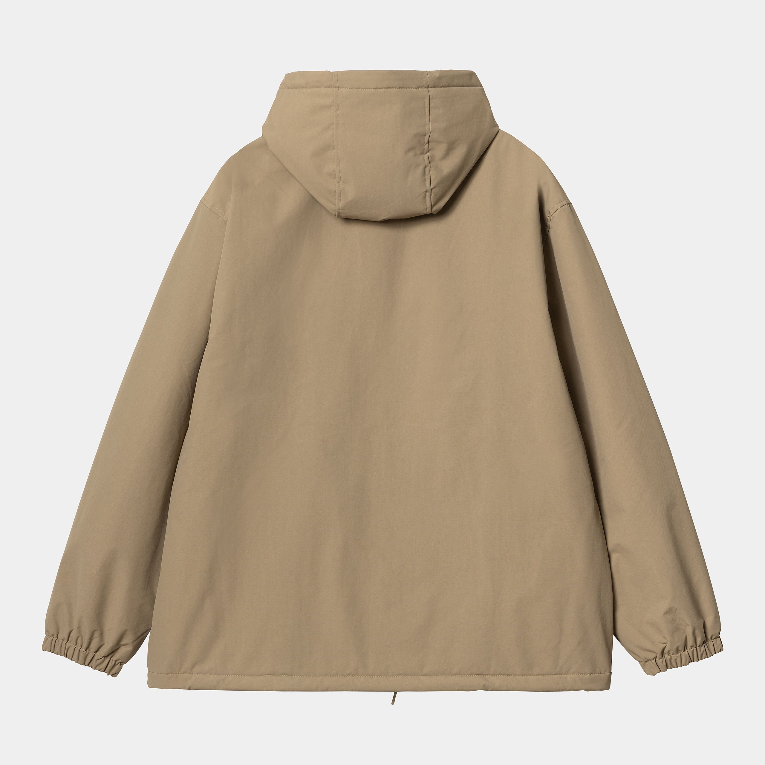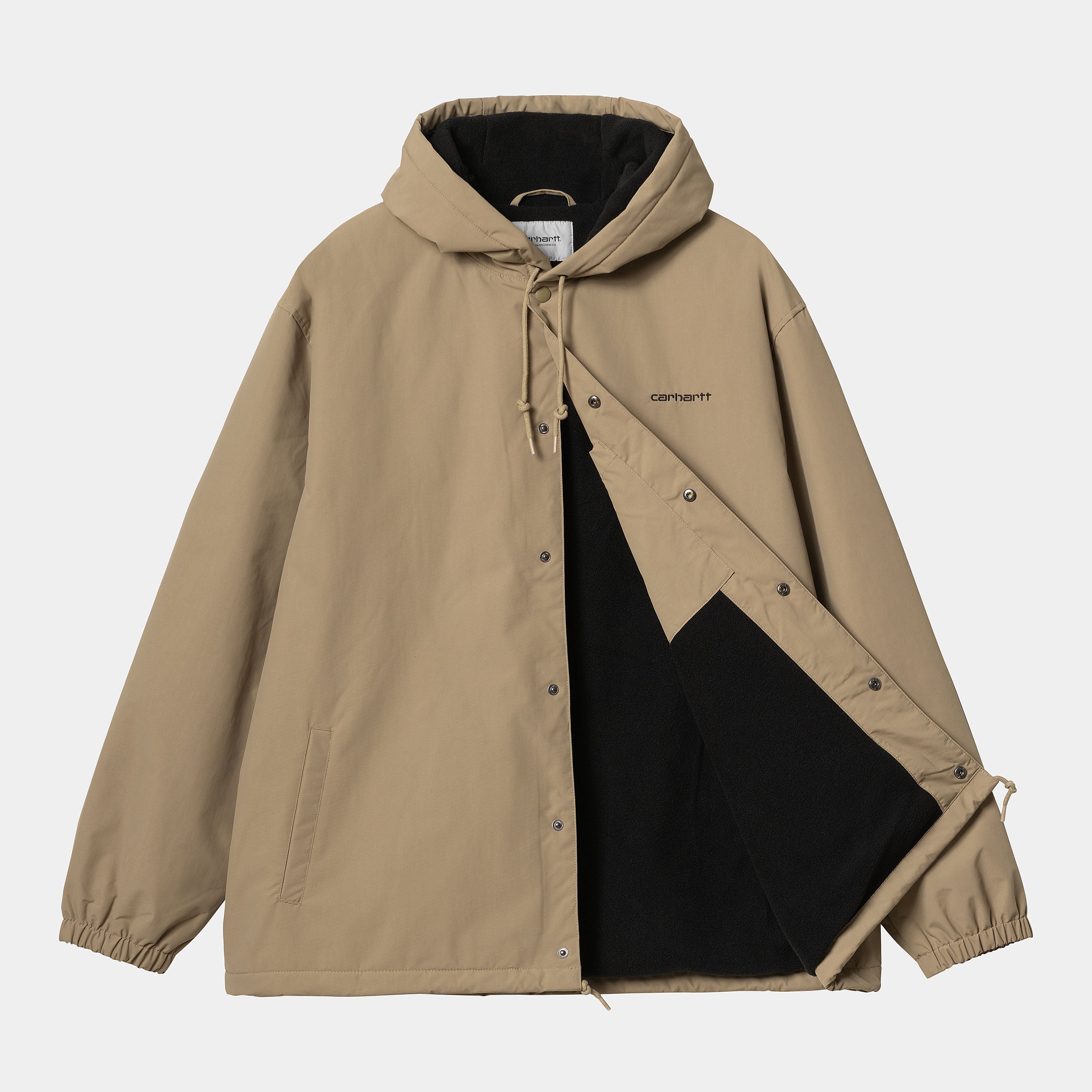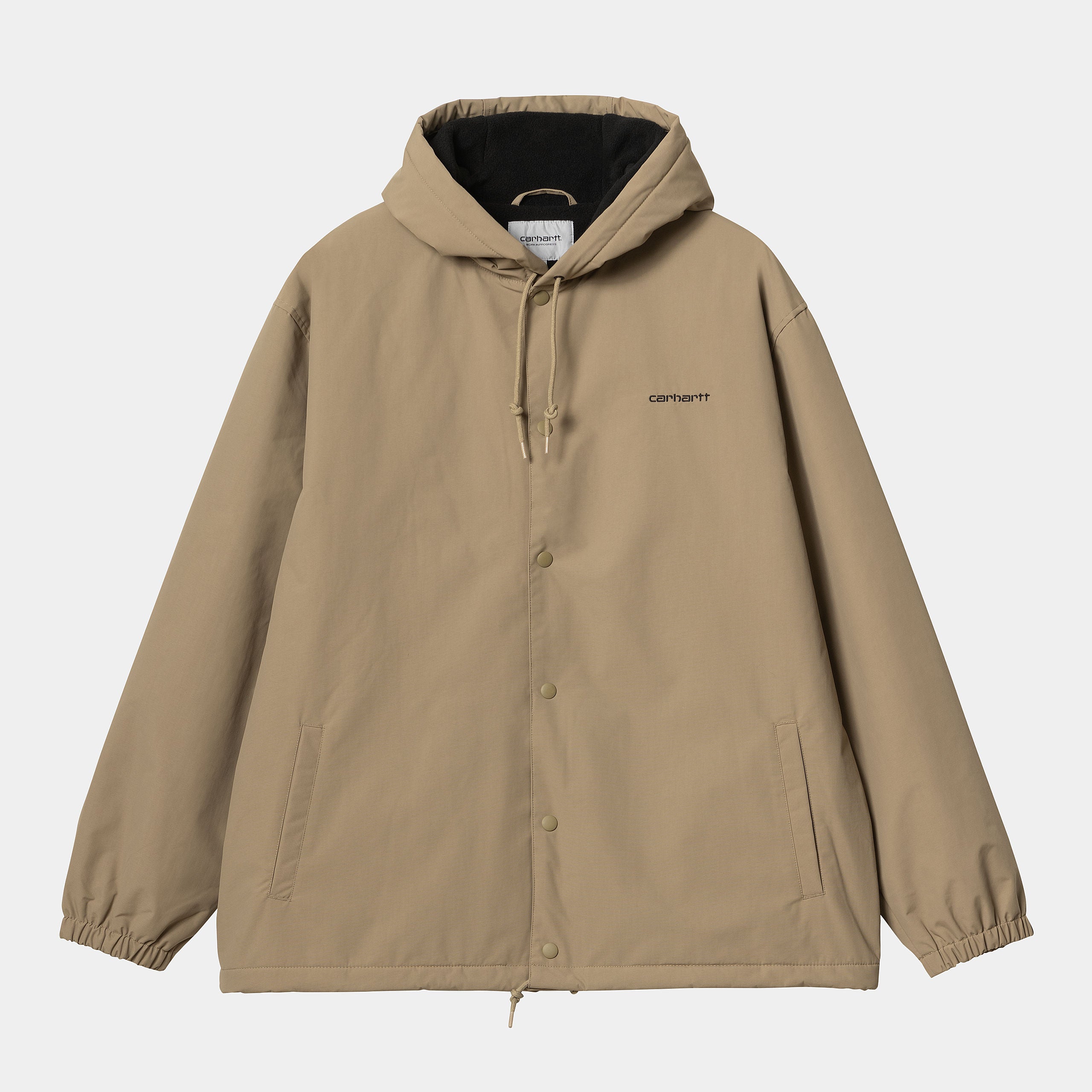 The Carhartt Hooded Coach Jacket has a sportswear-inspired silhouette and is made of nylon Supplex®, which is a water-repellent fabric engineered to be soft and lightweight, yet extremely resilient. It also has a fleece lining for warmth. The item is detailed with tonal snap-buttons and two side pockets, and has an adjustable hood and hem that allows the fit to be altered.