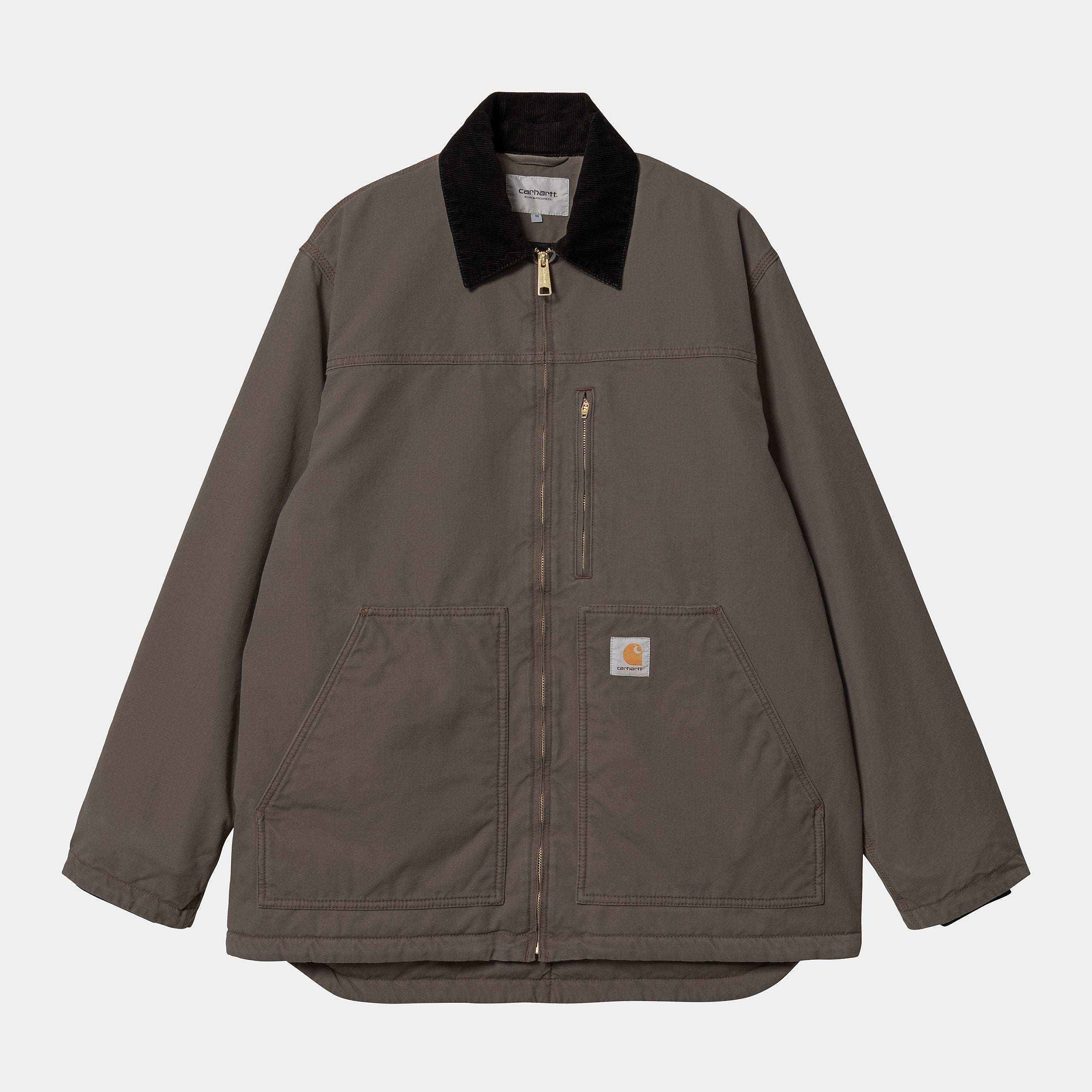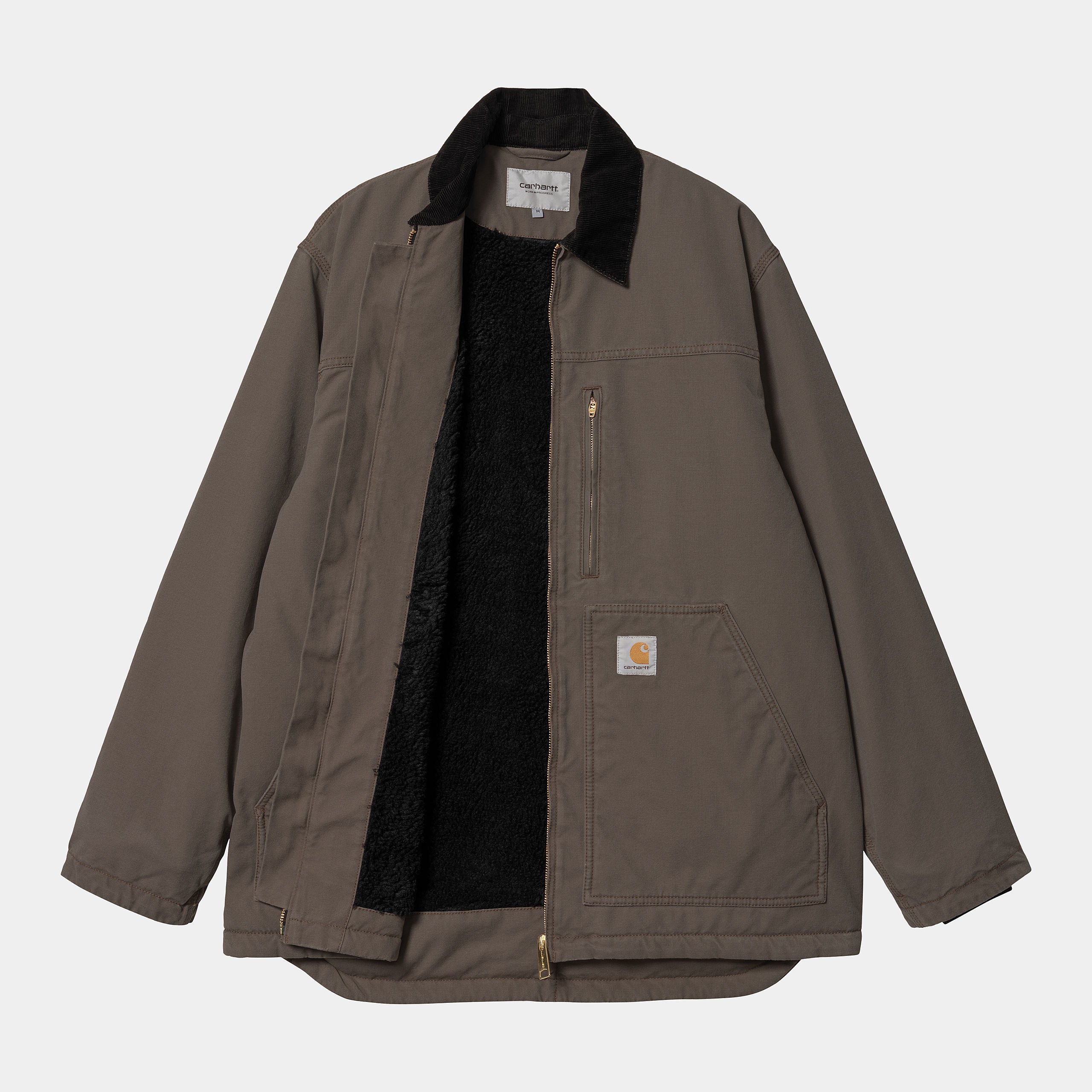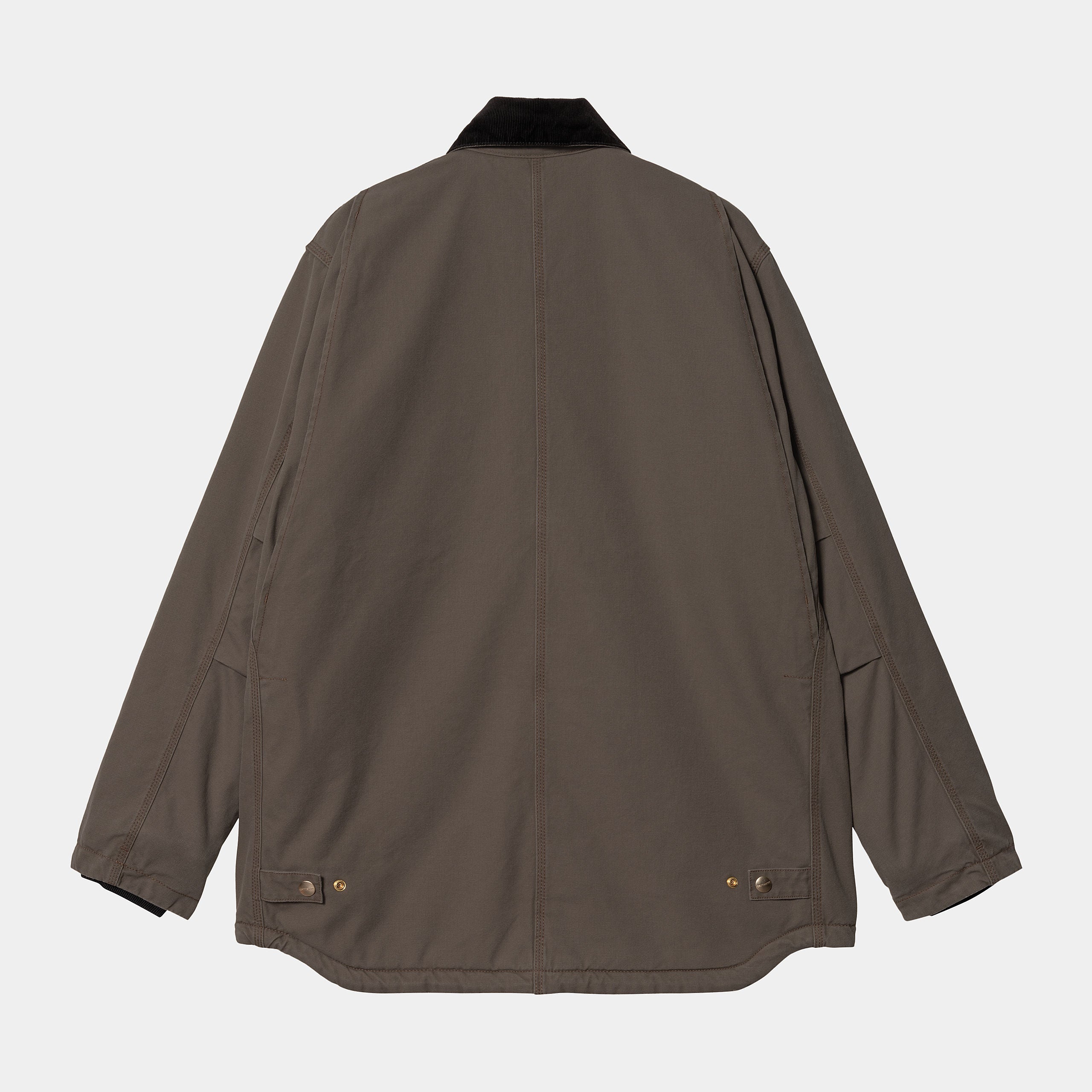 The Arlington Coat is constructed from Marshall canvas, which is a midweight cotton fabric that has been heavily stone washed, resulting in a softer and subtly worn-in appearance. The garment is lined with pile fleece and features a tactile corduroy collar. Additional insulation comes from diamond-quilted, nylon-lined sleeves, as well as a rib-knit hem and cuffs. Its silhouette is loose with a slightly dipped back hem.