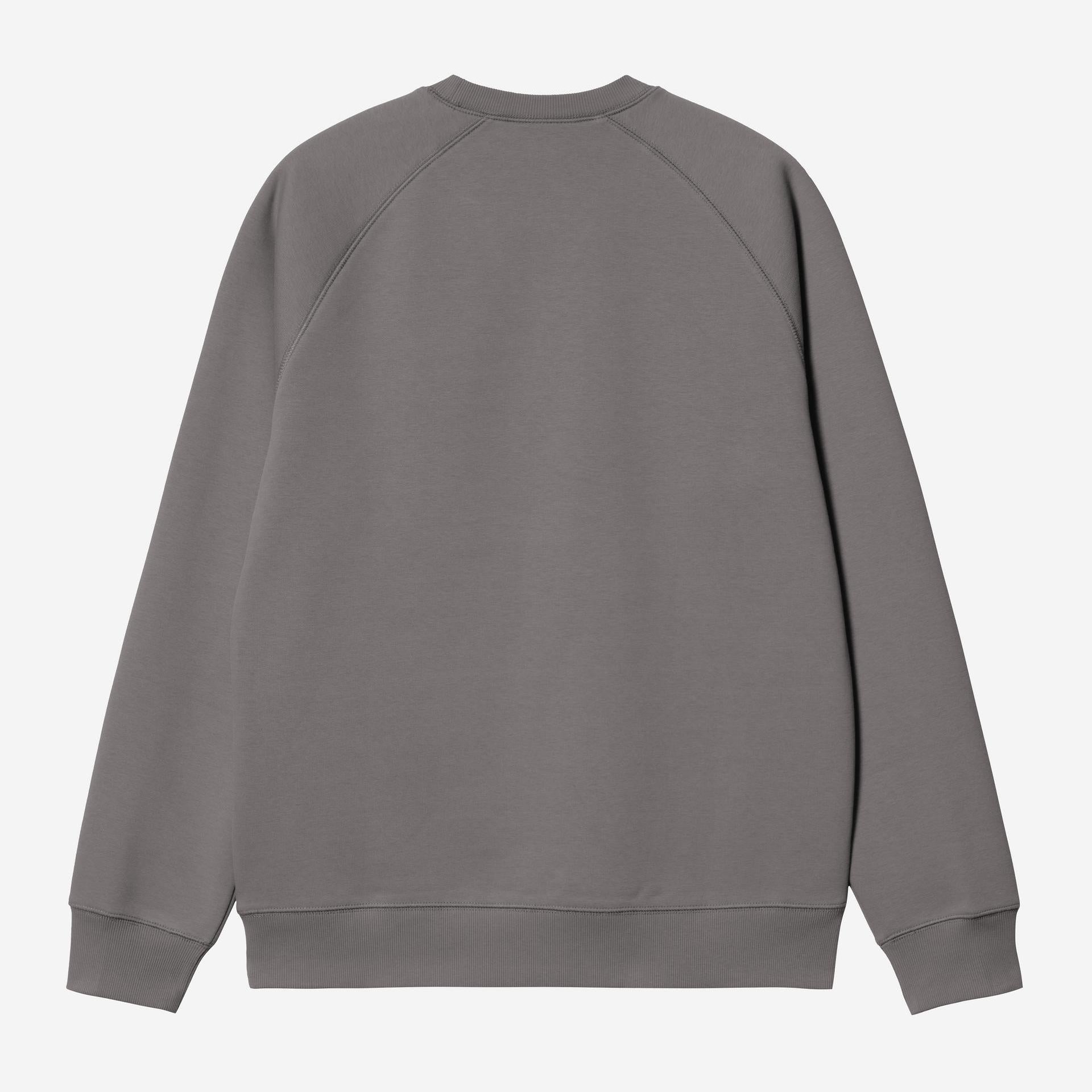 The Carhartt WIP Chase Sweatshirt is constructed from heavyweight polycotton fabric in a regular fit. The fabric has also been brushed, giving it a fleece-like backing. The item features raglan sleeves and is detailed with flatlock stitching. An embroidered 'C' Logo appears on the left sleeve.