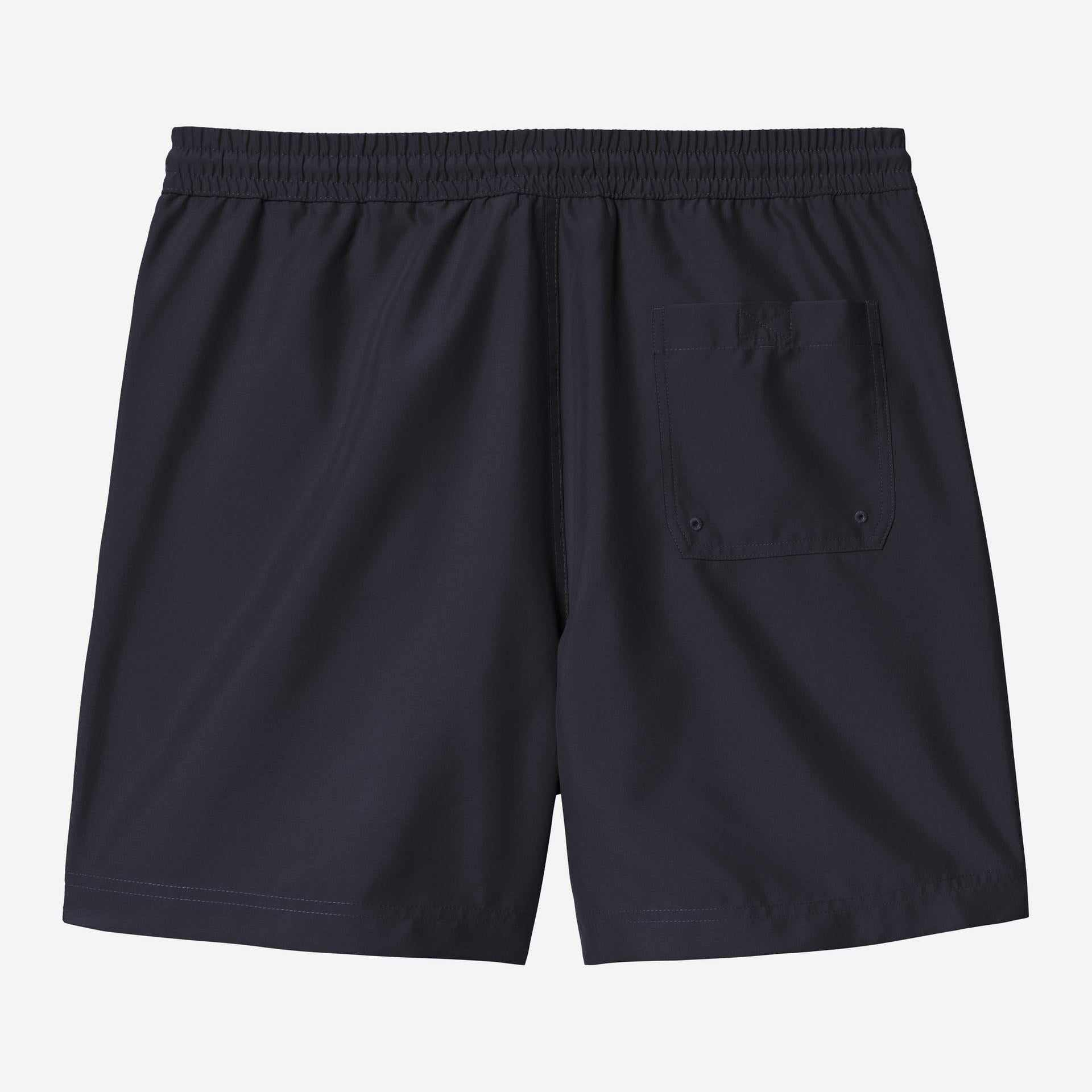 The Carhartt WIP Chase Swim Trunks are constructed from lightweight polyester fabric with water-repellent, fast-drying qualities. They also feature an inner mesh lining. The trunks have two side seam pockets, as well as a back pocket with a key holder. An embroidered 'C' Logo appears on the left leg.