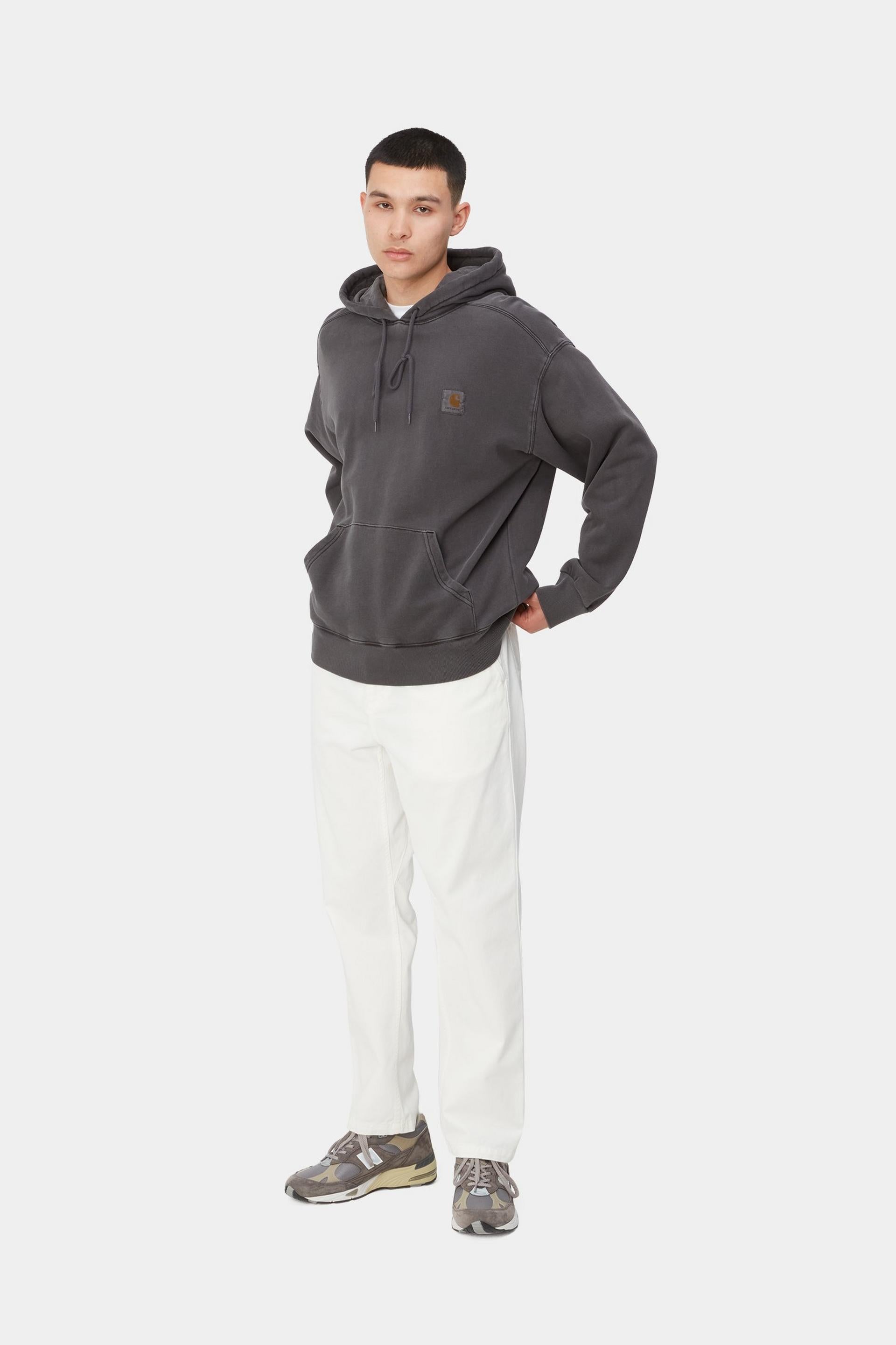 The Hooded Nelson Sweatshirt is constructed from heavyweight, unbrushed cotton jersey. The garment has been pigment dyed for a more saturated color. Features a kangaroo pocket and a diamond quilted hood with padded lining. This item has a bold 'balloon' fit, which is a little looser and boxier, but also characterized by dropped shoulders and ribbed cuffs. Finished with a classic woven Carhartt WIP label on the left chest.