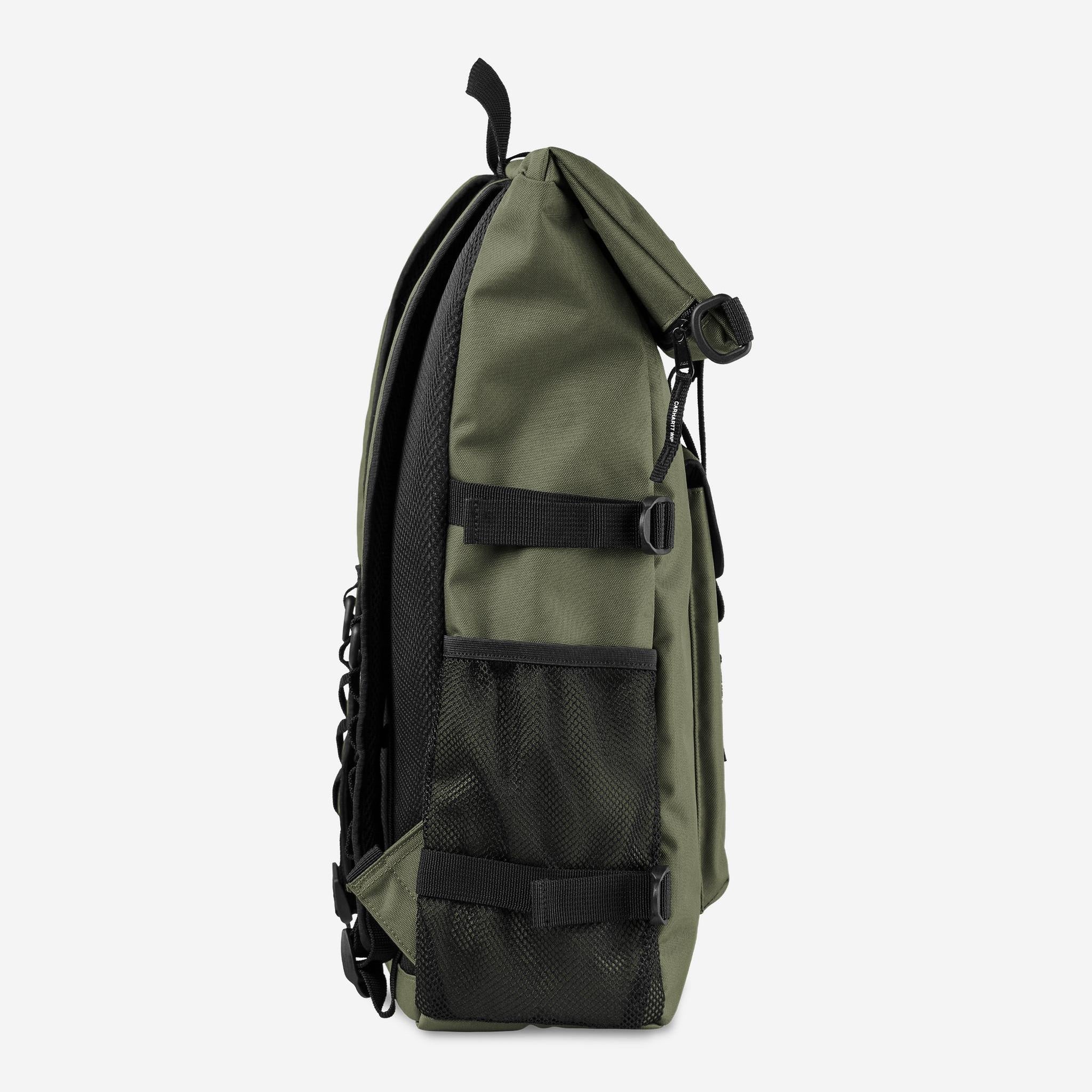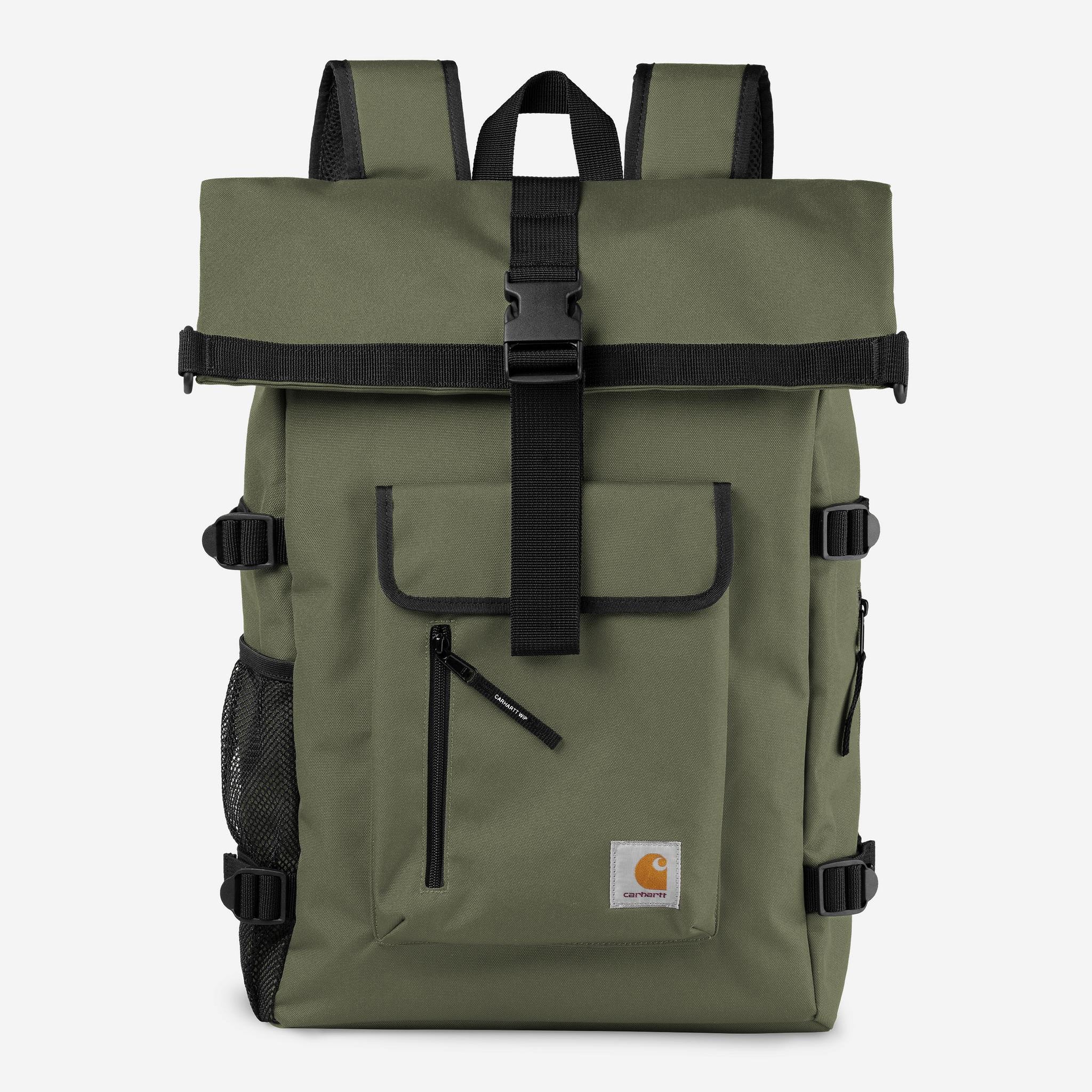 The Carhartt WIP Philis Backpack is an expandable style constructed from water-repellent, recycled polyester canvas. It features an unlined main compartment with a zip and flap closure, a padded inside pocket, and adjustable shoulder straps.