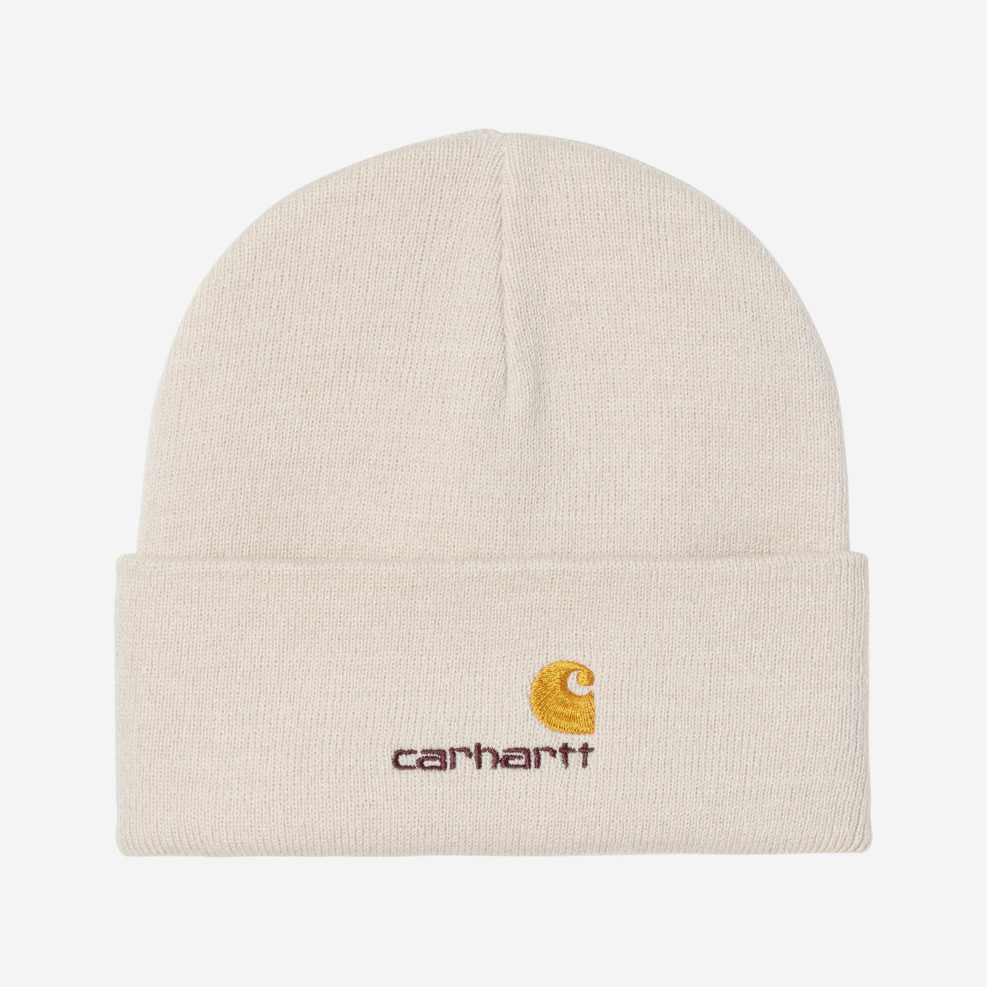 The Carhartt WIP American Script Beanie is a stretch-knit style made from recycled polyester fibers. An embroidered, two-tone American Script logo appears on the cuffs.