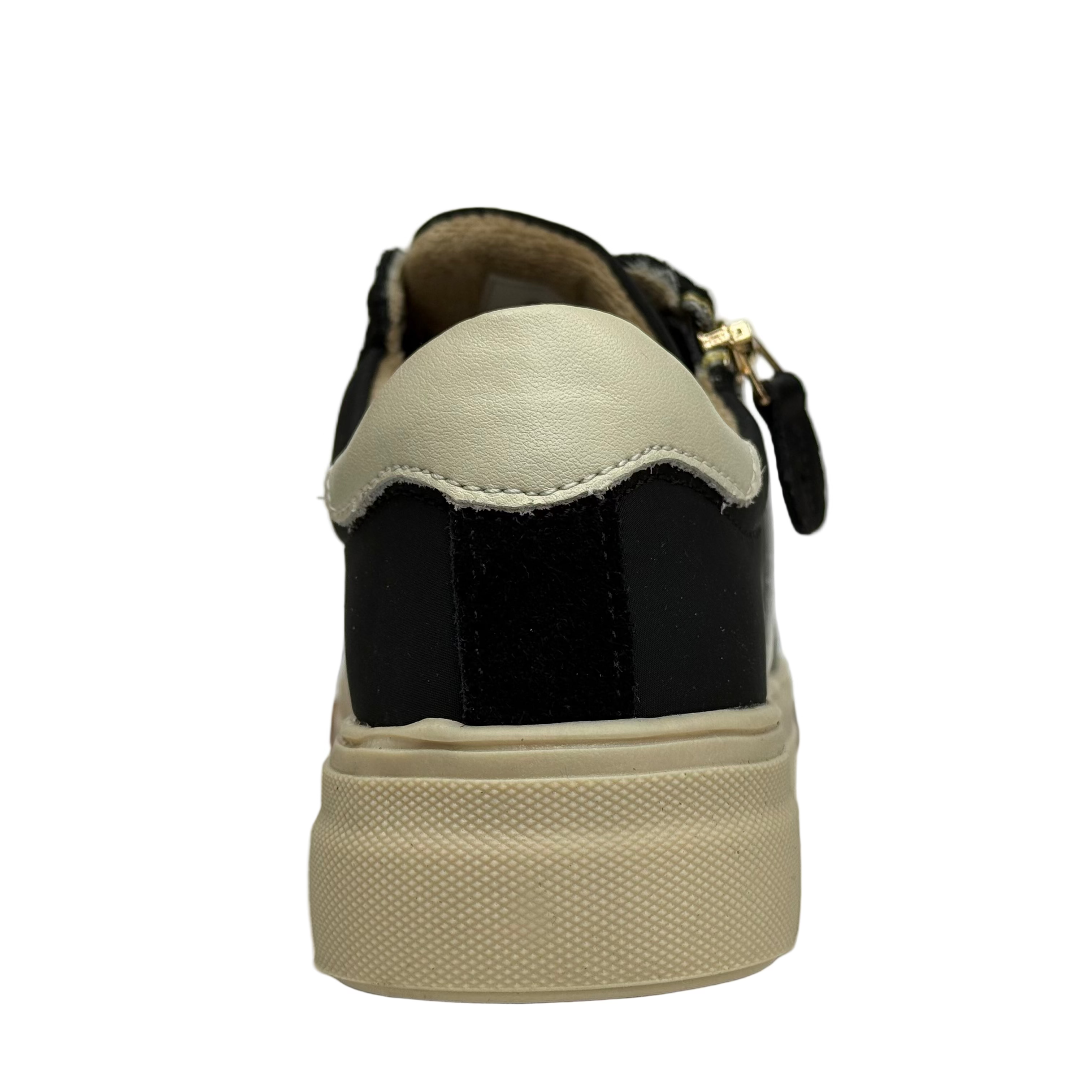 Drilleys Womens Eighty One Trainers in Whipped Ink. Faux suede leather upper in Black with Beige detailing. Side zip for ease of foot entry. Beige sole.