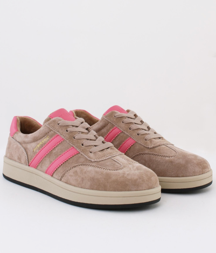 Drilleys Womens Eighty Four Trainers in beige. Faux suede leather upper in beige with bright pink sherbet detailing. Biege gum sole.