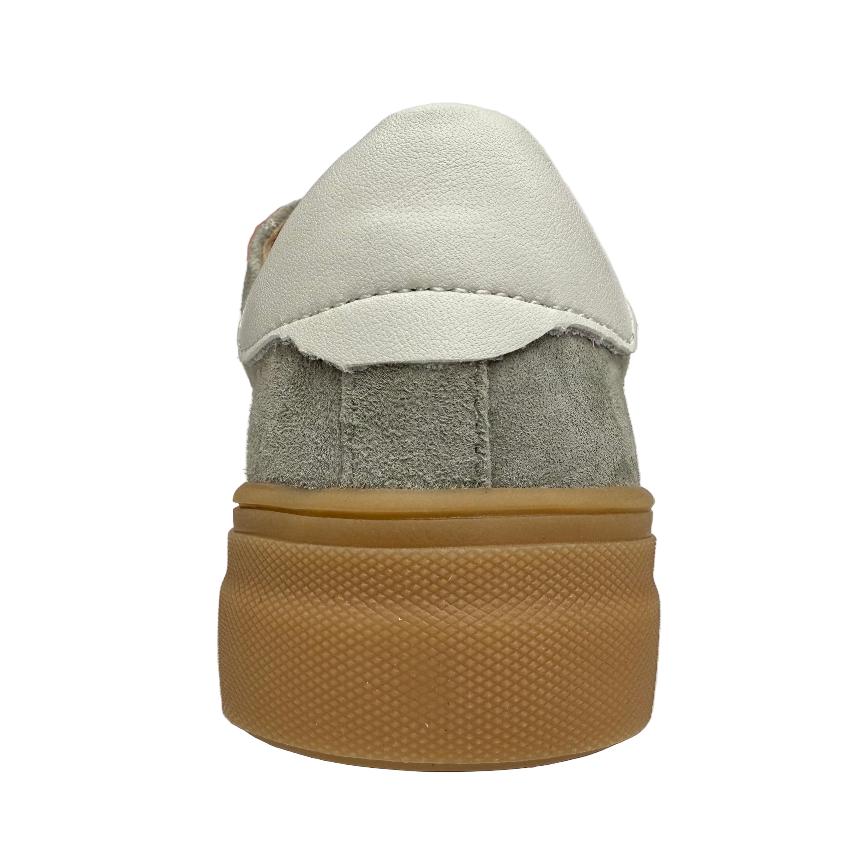 Drilleys Womens Ninety Trainers in Calming Green. Faux suede leather upper in green with beige accent detailing. Gum sole.