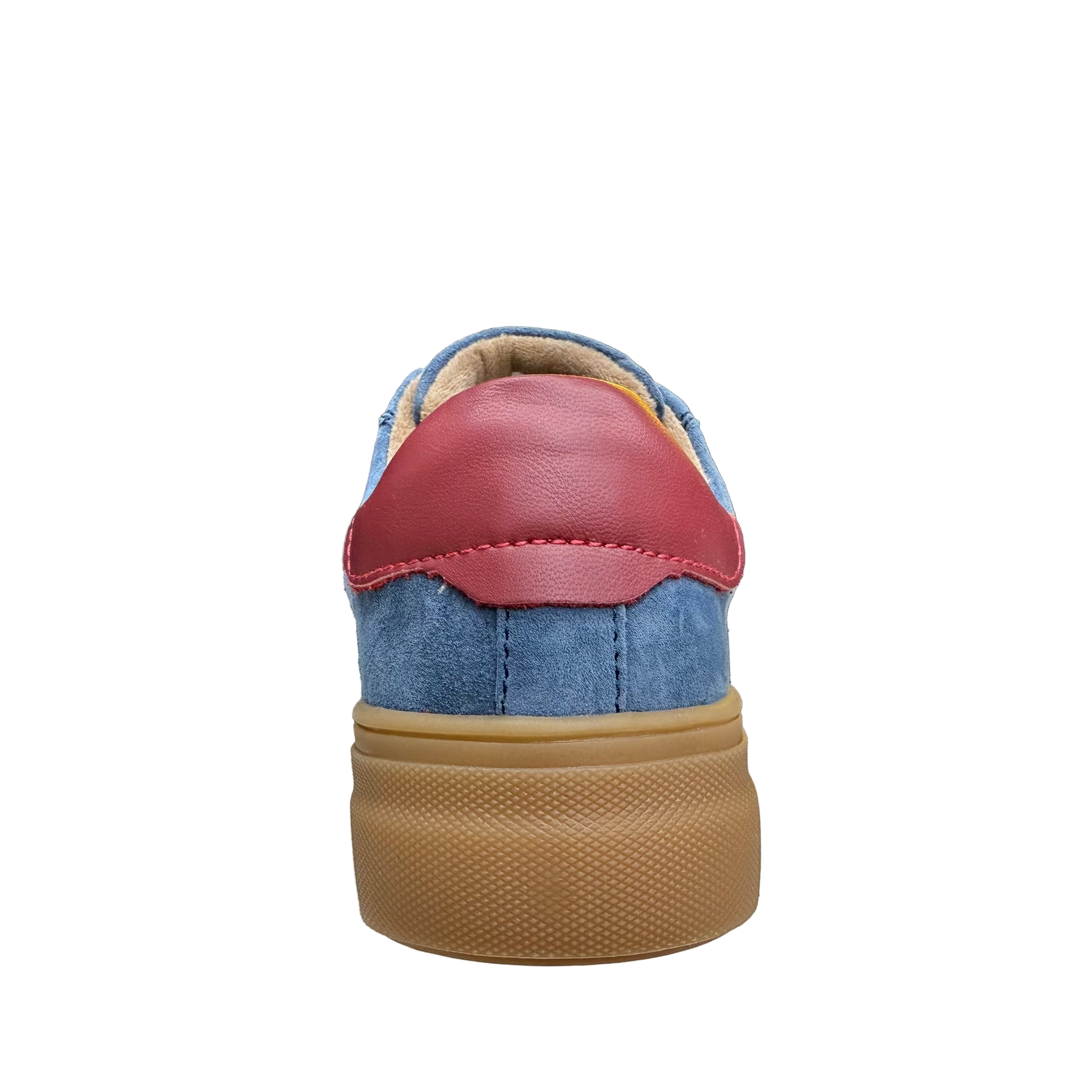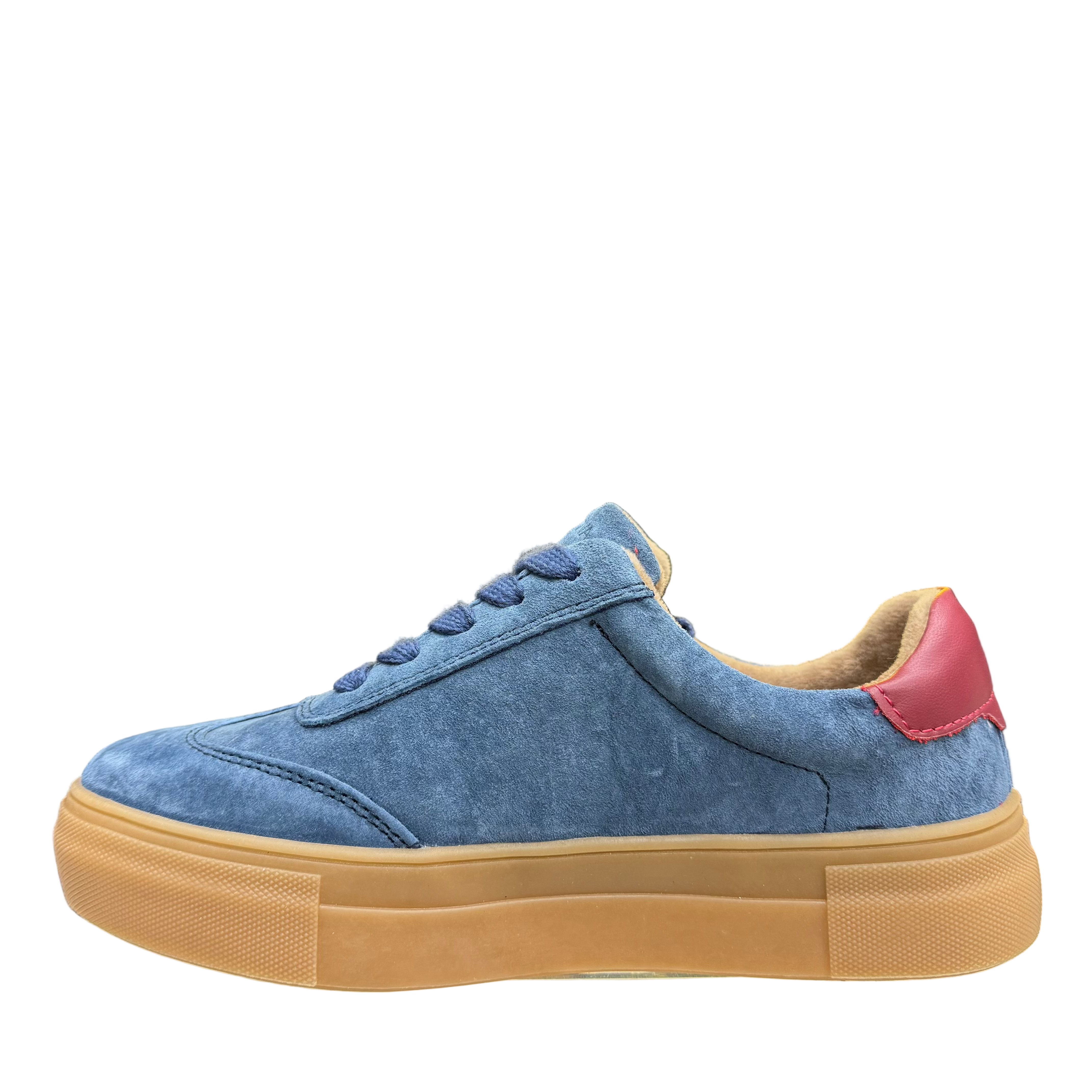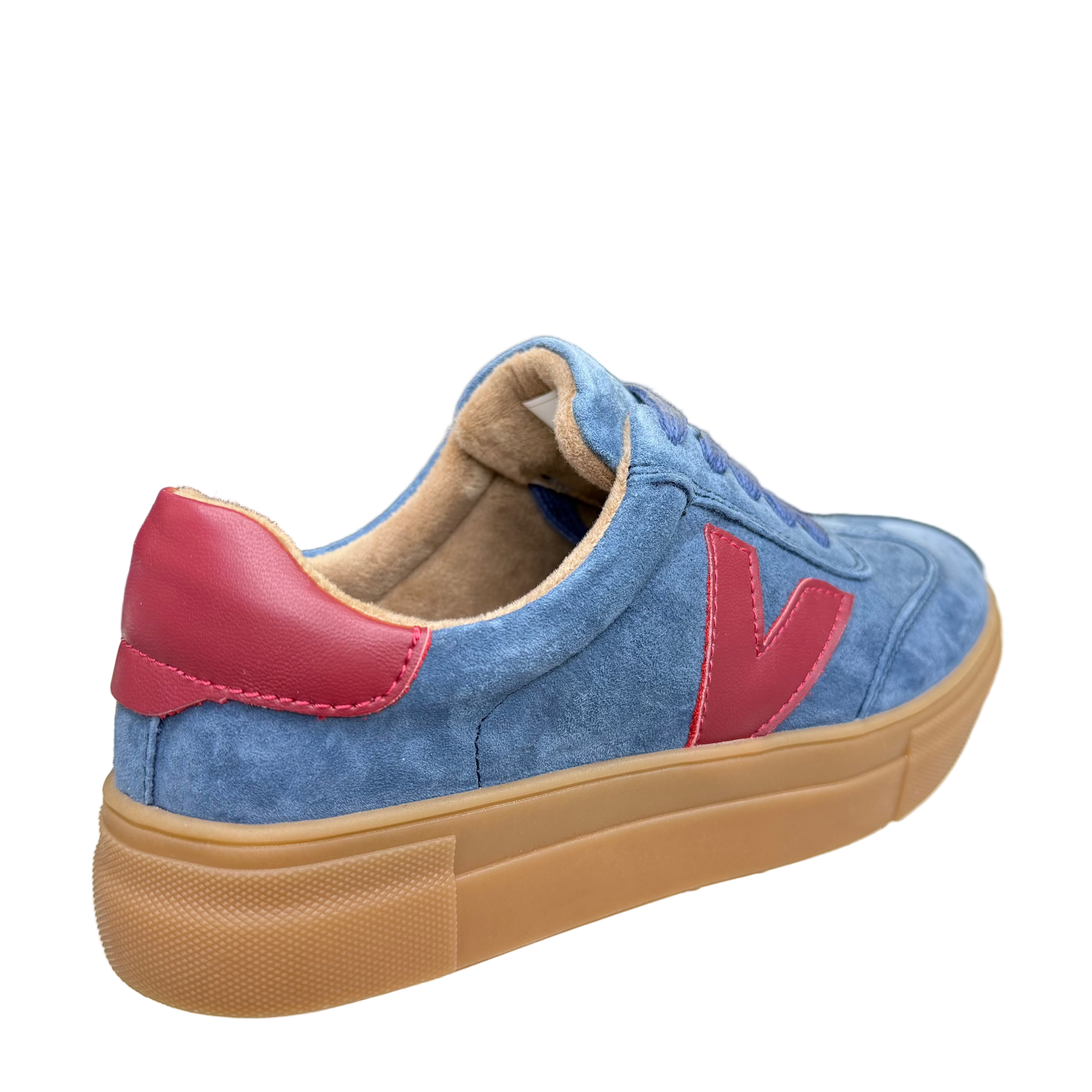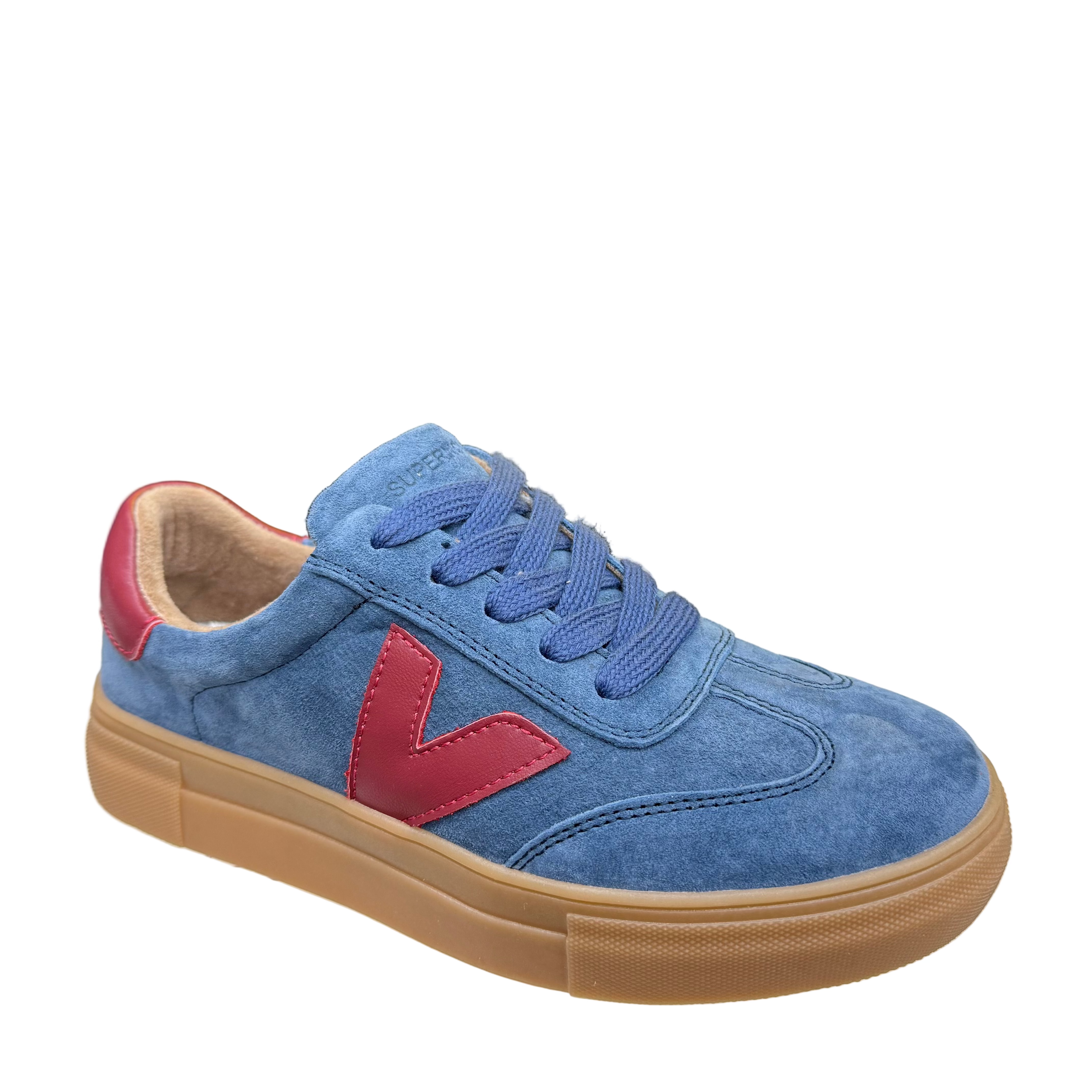 Drilleys Womens Ninety Trainers in Deep Blue. Faux suede leather upper in blue with maroon accent detailing. Gum sole.