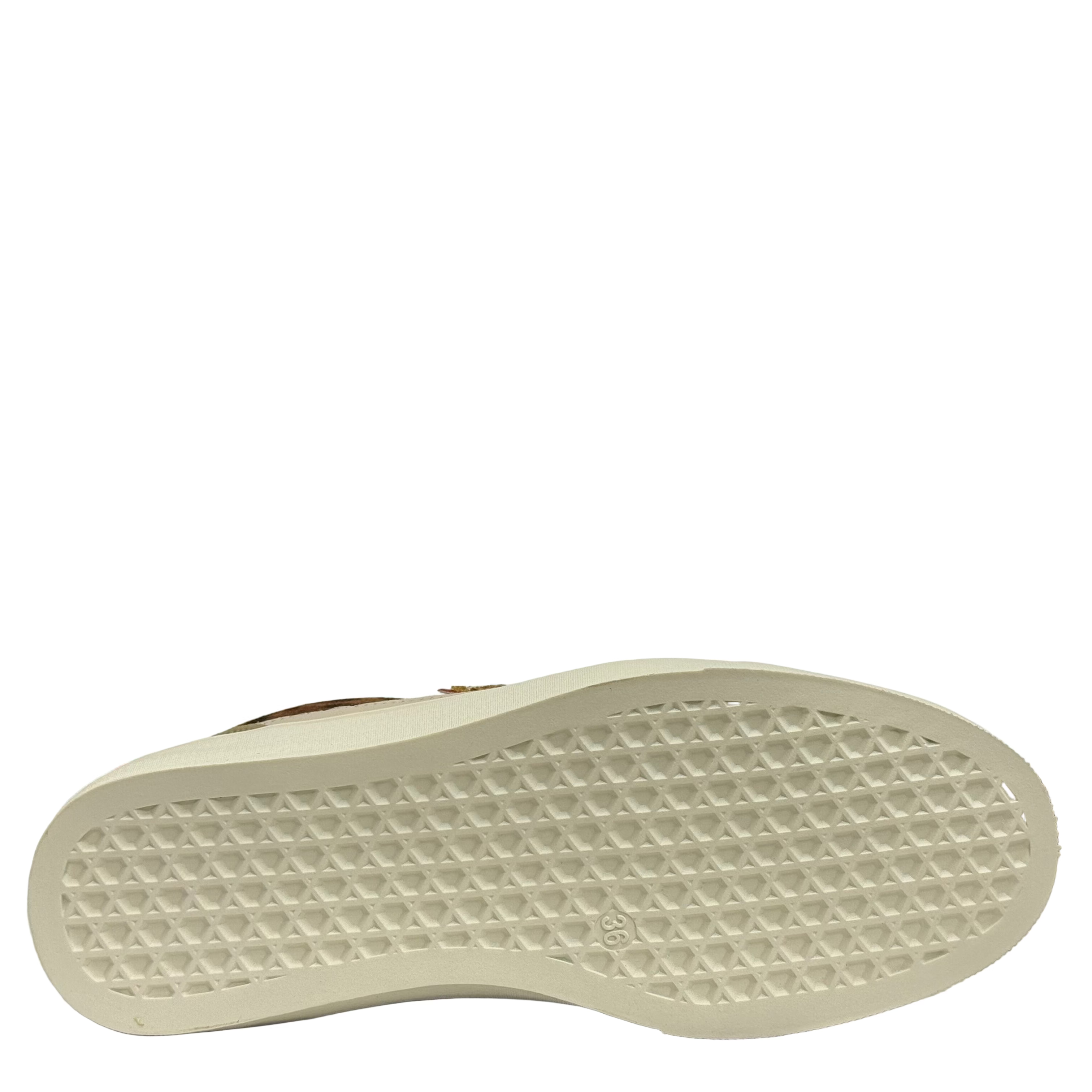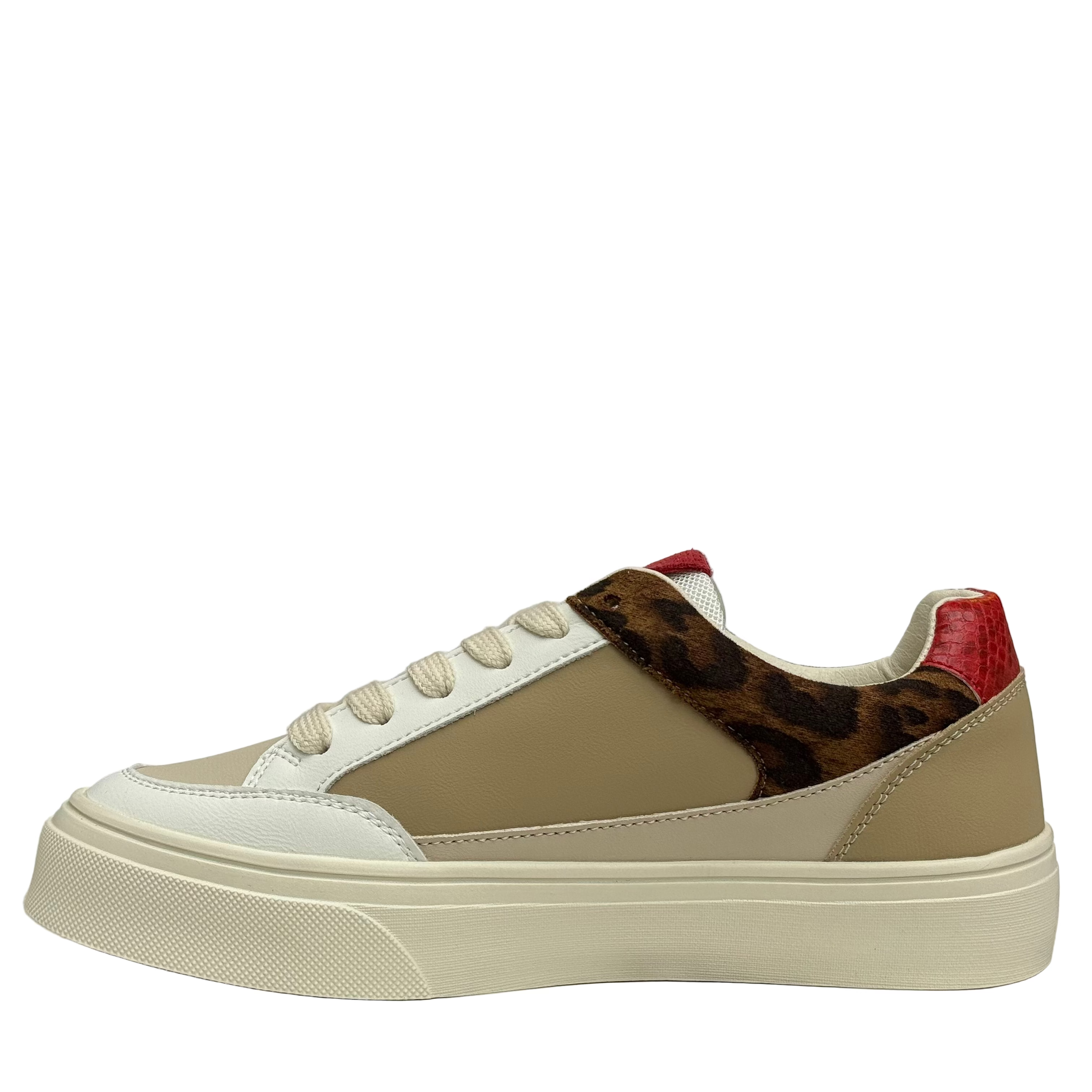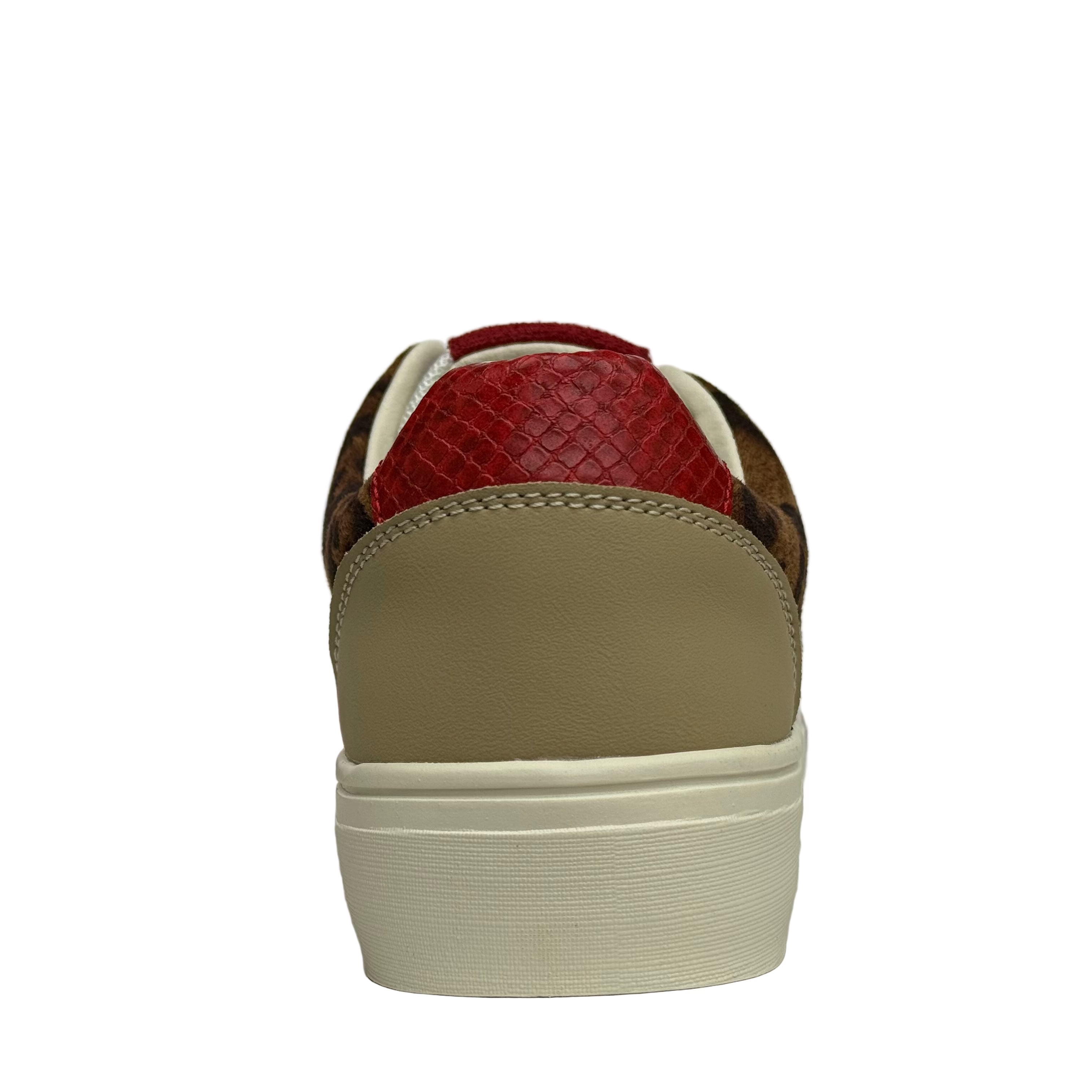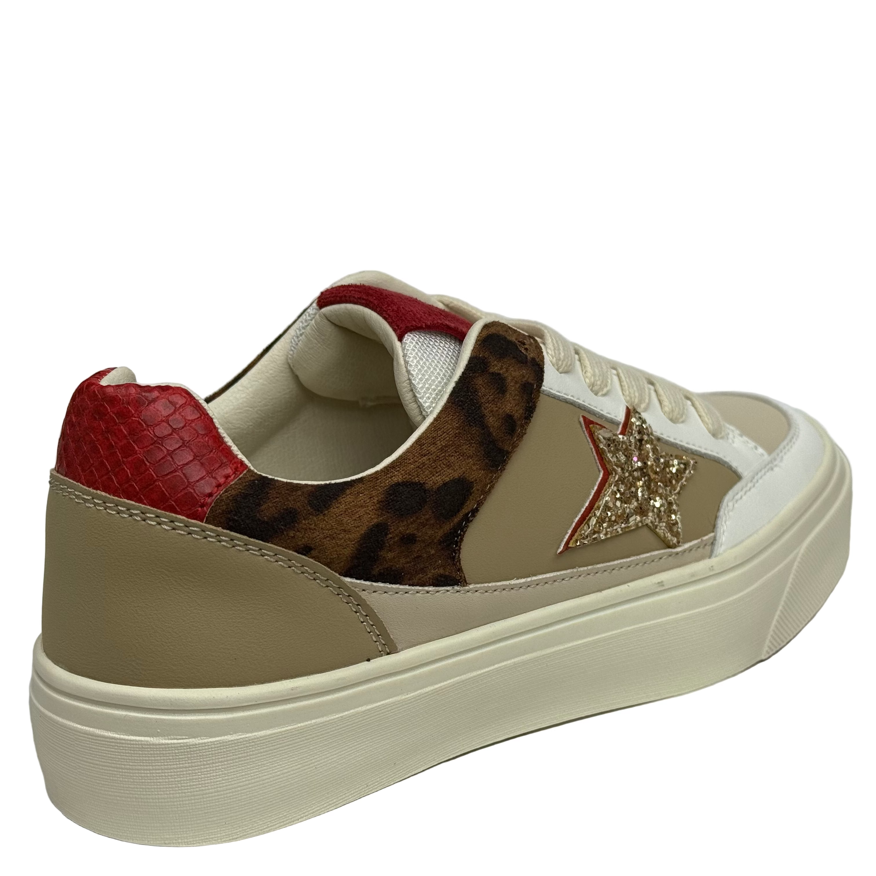 Drilleys Womens Seventy Three Trainers in Whipped Foil. Faux leather upper in beige. Red detailing to tongue and vamp. Animal print detailing. Glitter star on side.