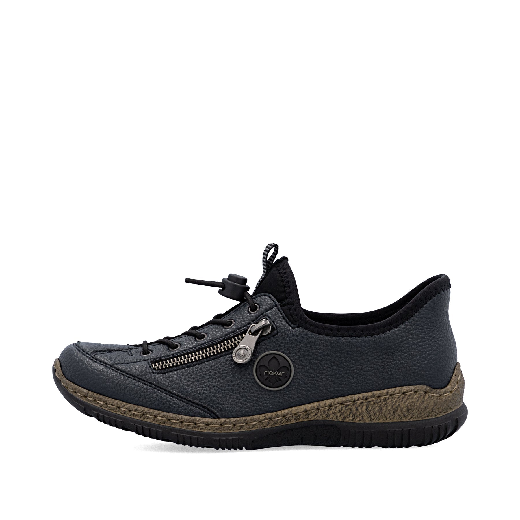 Rieker Womens Shoe with faux leather upper. Neoprene cuff and lining. Slip on style with drawstring toggle for adjusting fit. Soft cushioned insole. Light and flexible.
