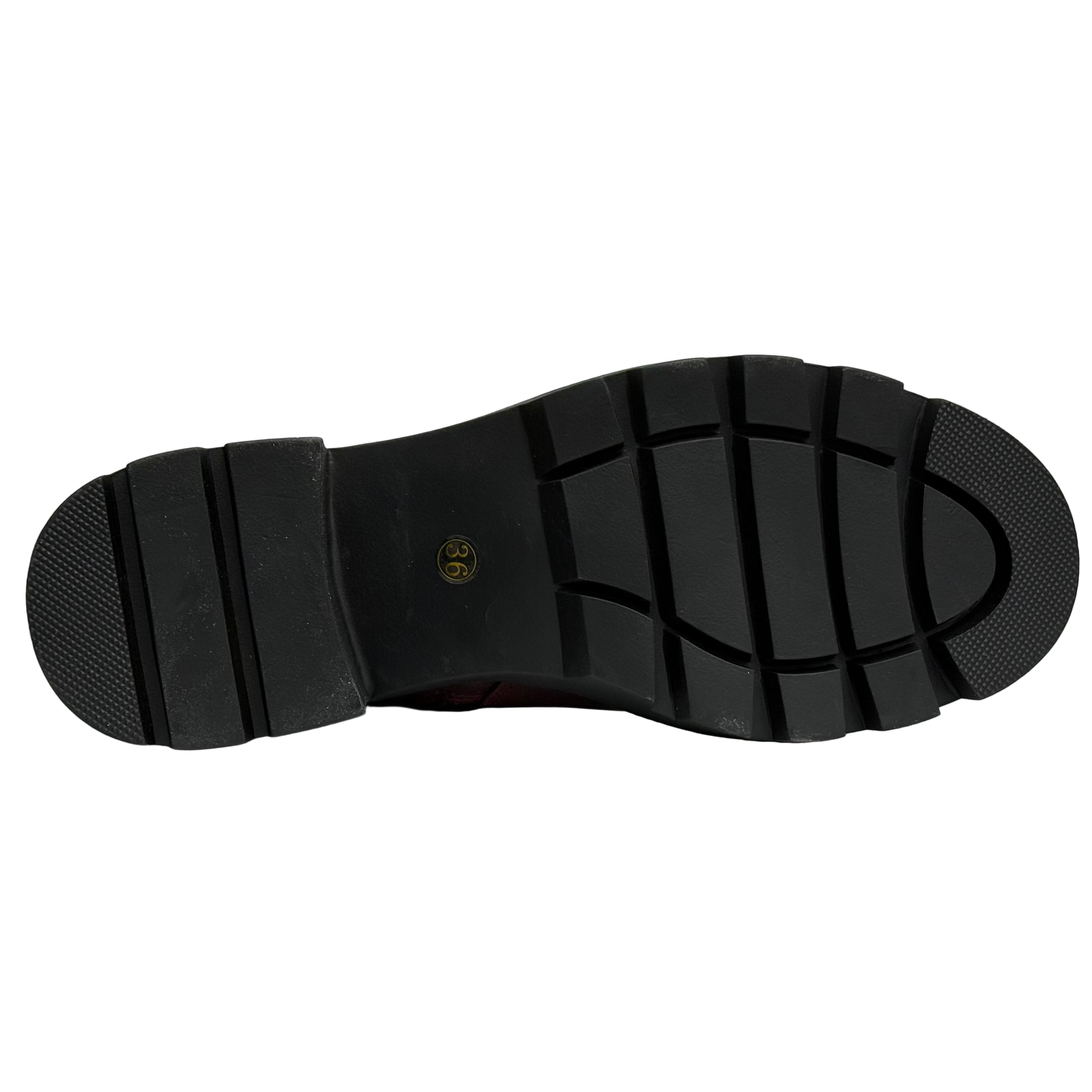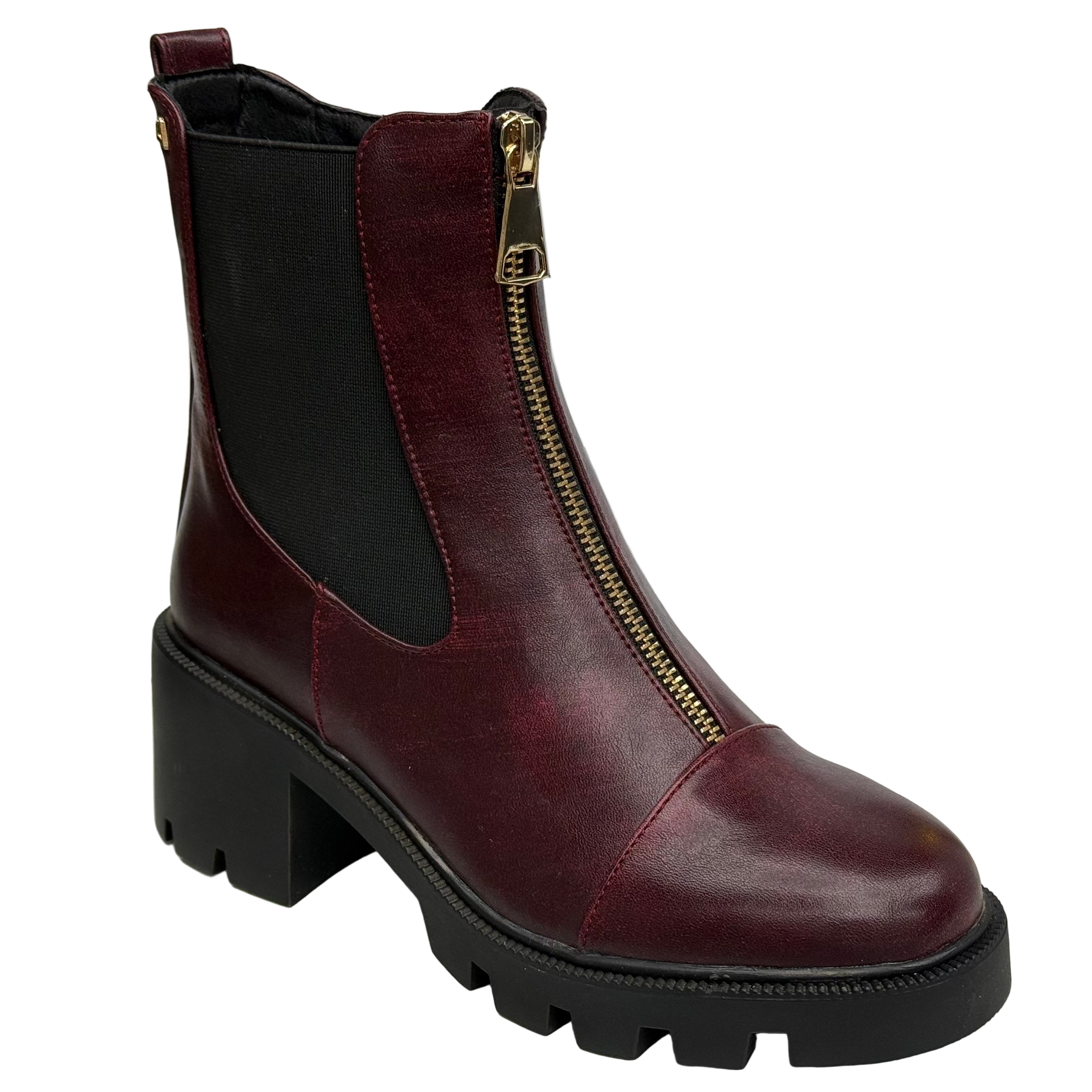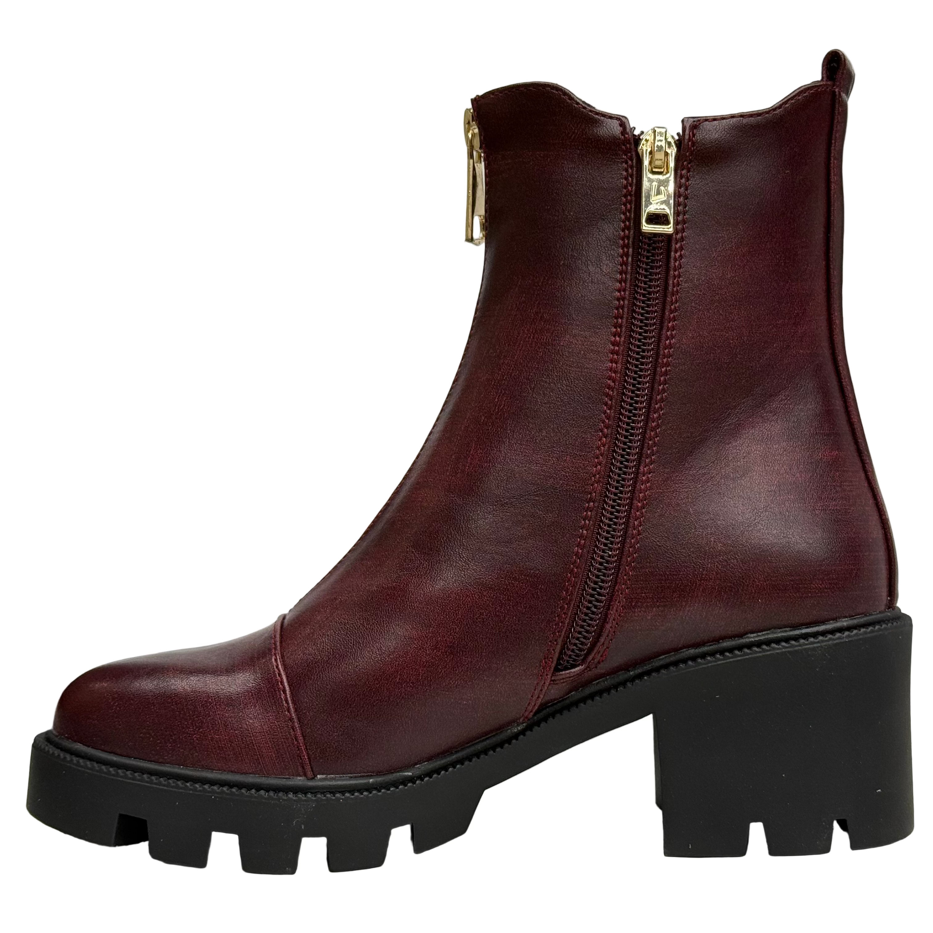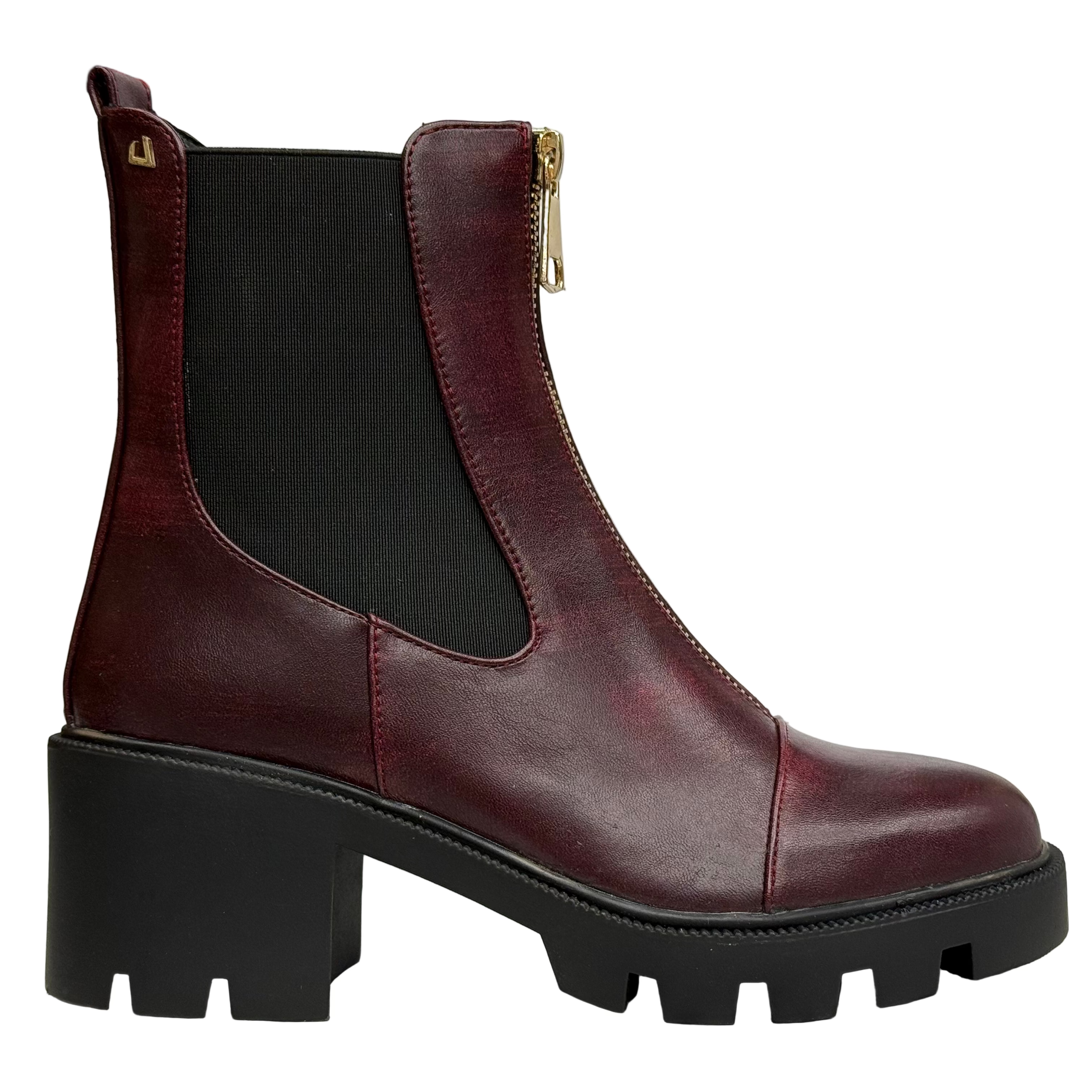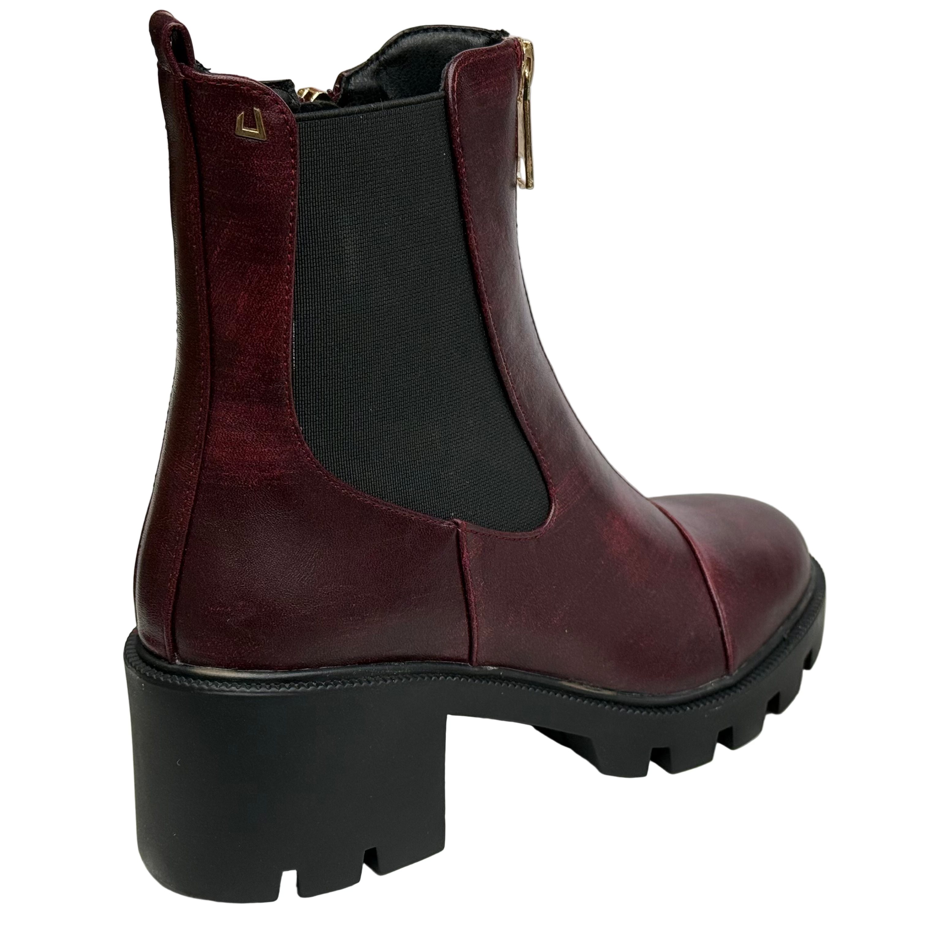 The Una Healy Women’s I’m Sorry Chelsea Boot in vibrant Baked Cherry Red faux leather. This fresh twist on the timeless Chelsea boot includes a handy side zip for easy on-and-off, plus a faux front zip purely for flair. Enjoy confident strides on the chunky sole with a deep tread, topped off with a low block heel for just the right lift.