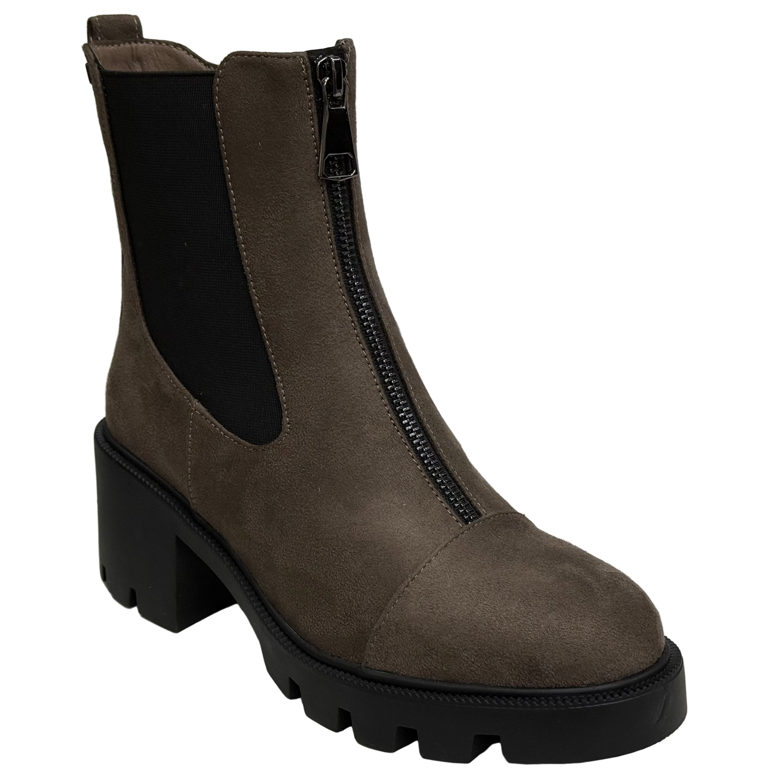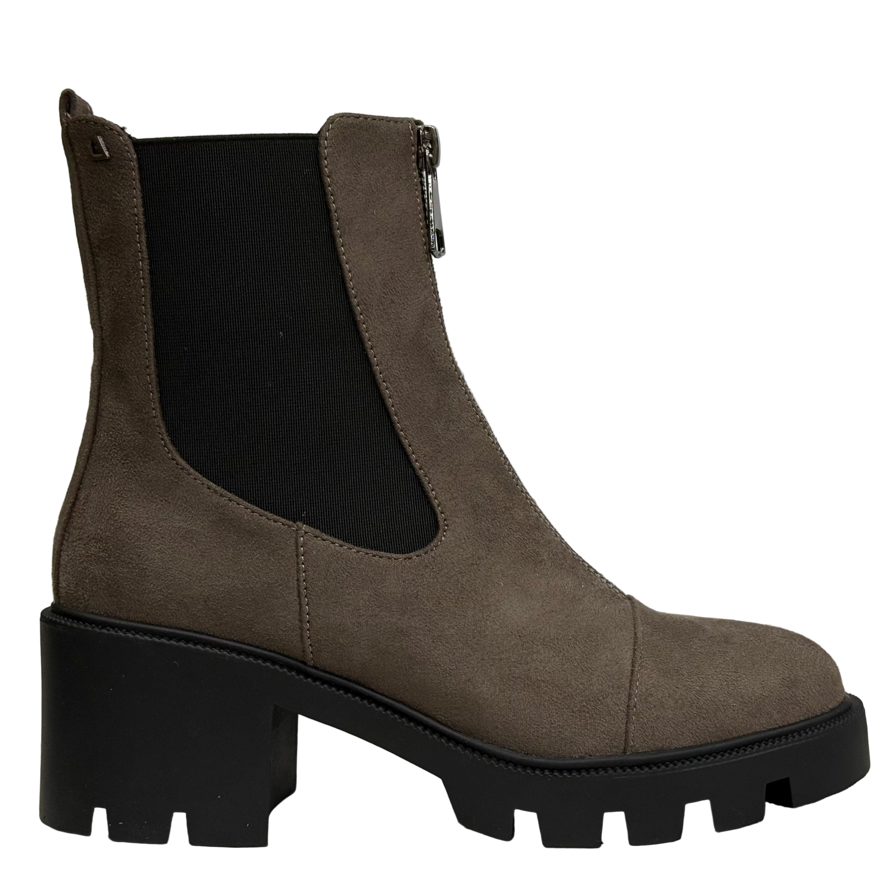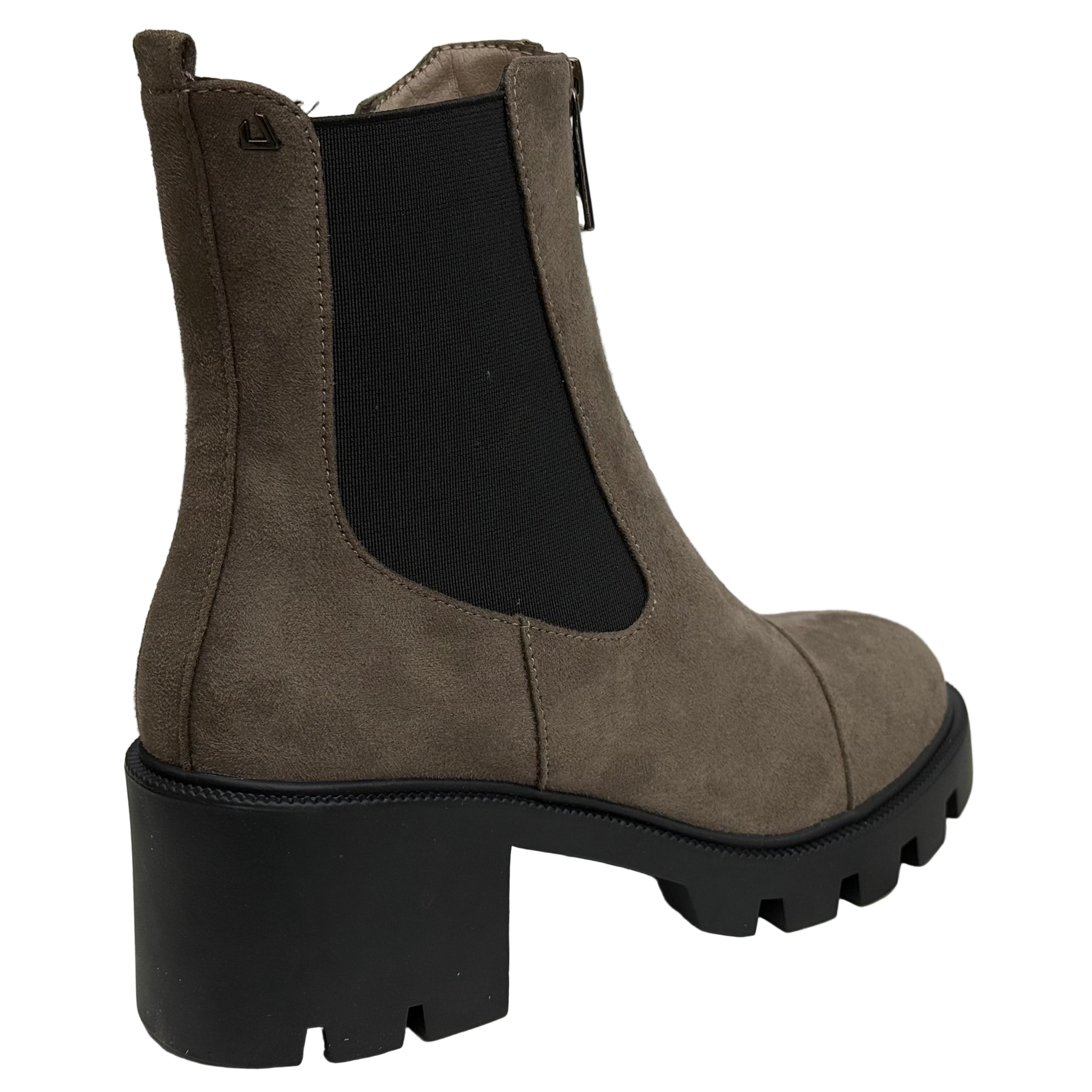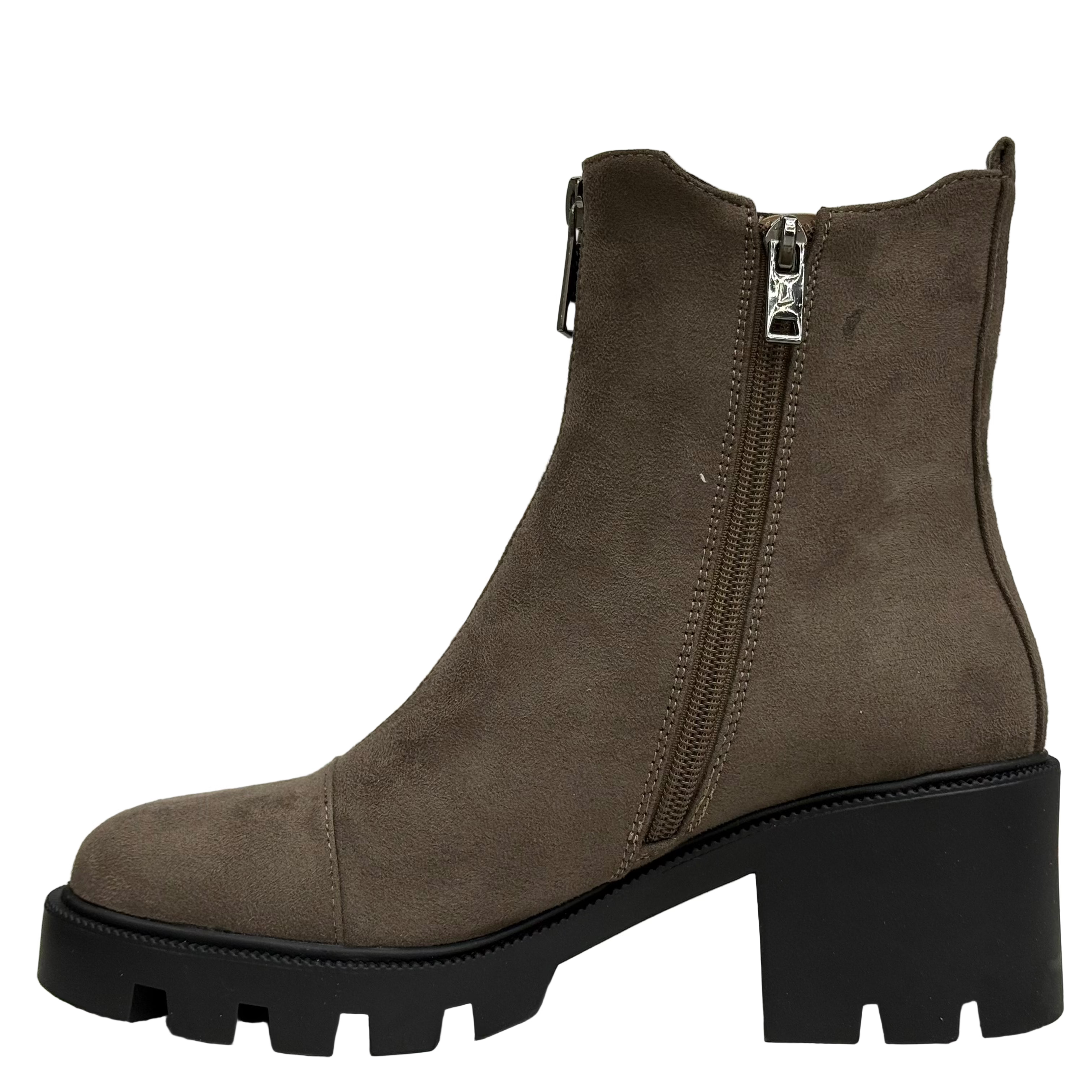 The Una Healy Women's "I'm Sorry" Chelsea Boot in a warm Earthy Brown faux suede. This fresh twist on the classic Chelsea boot includes a handy side zip for easy slipping on, plus a funky faux front zip just for looks. The chunky sole with deep tread keeps you grounded, while the low block heel adds just the right amount of lift. Perfect for adding a dash of cool to any outfit!