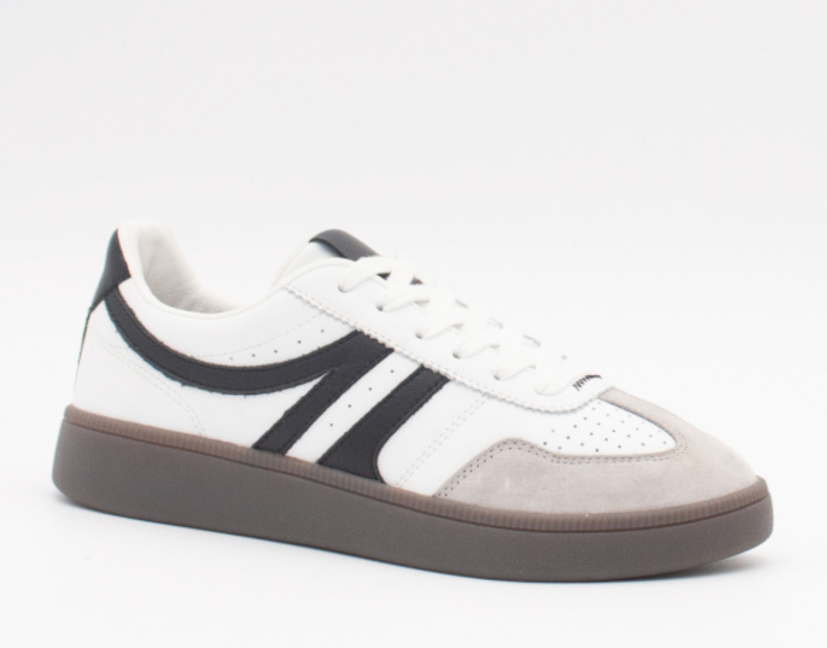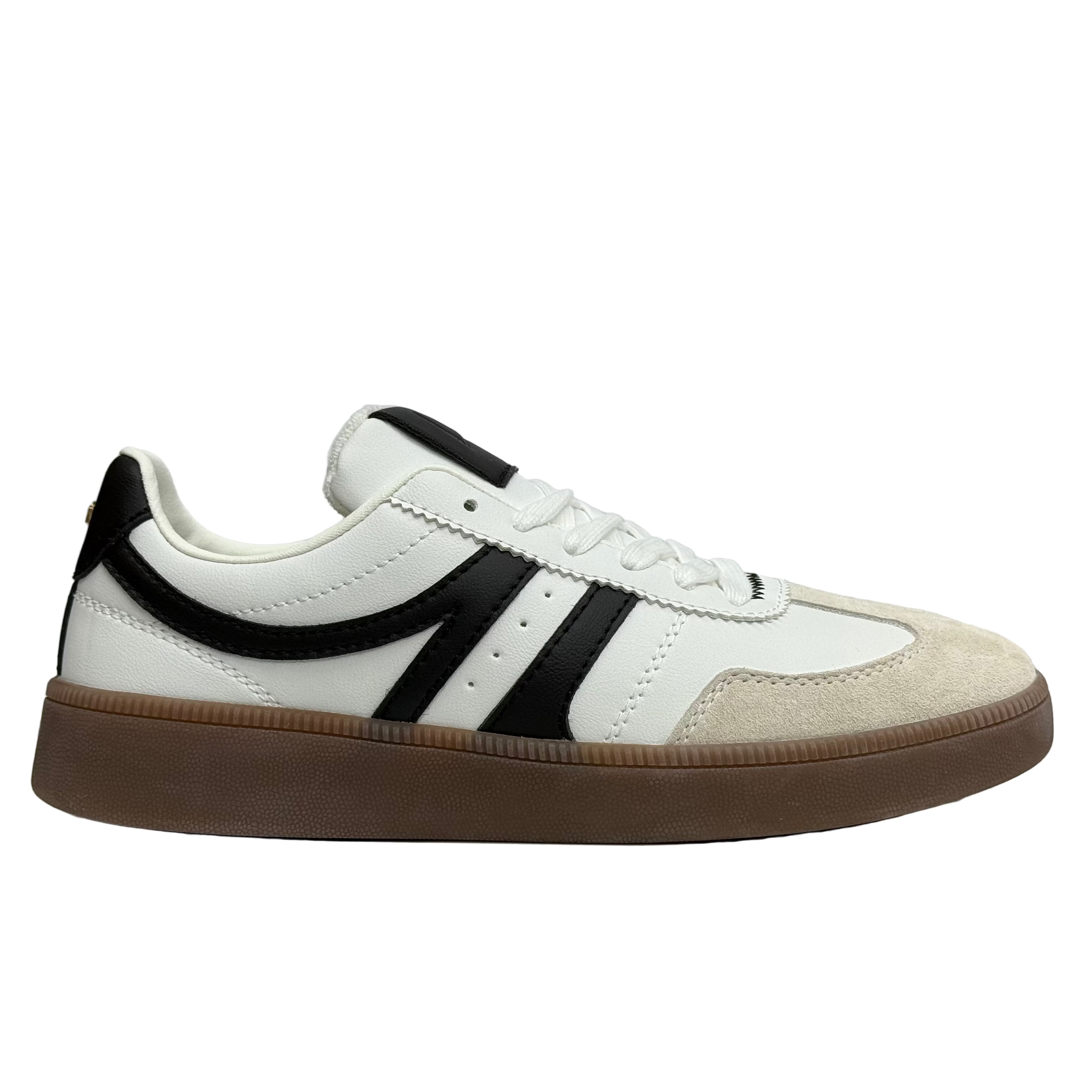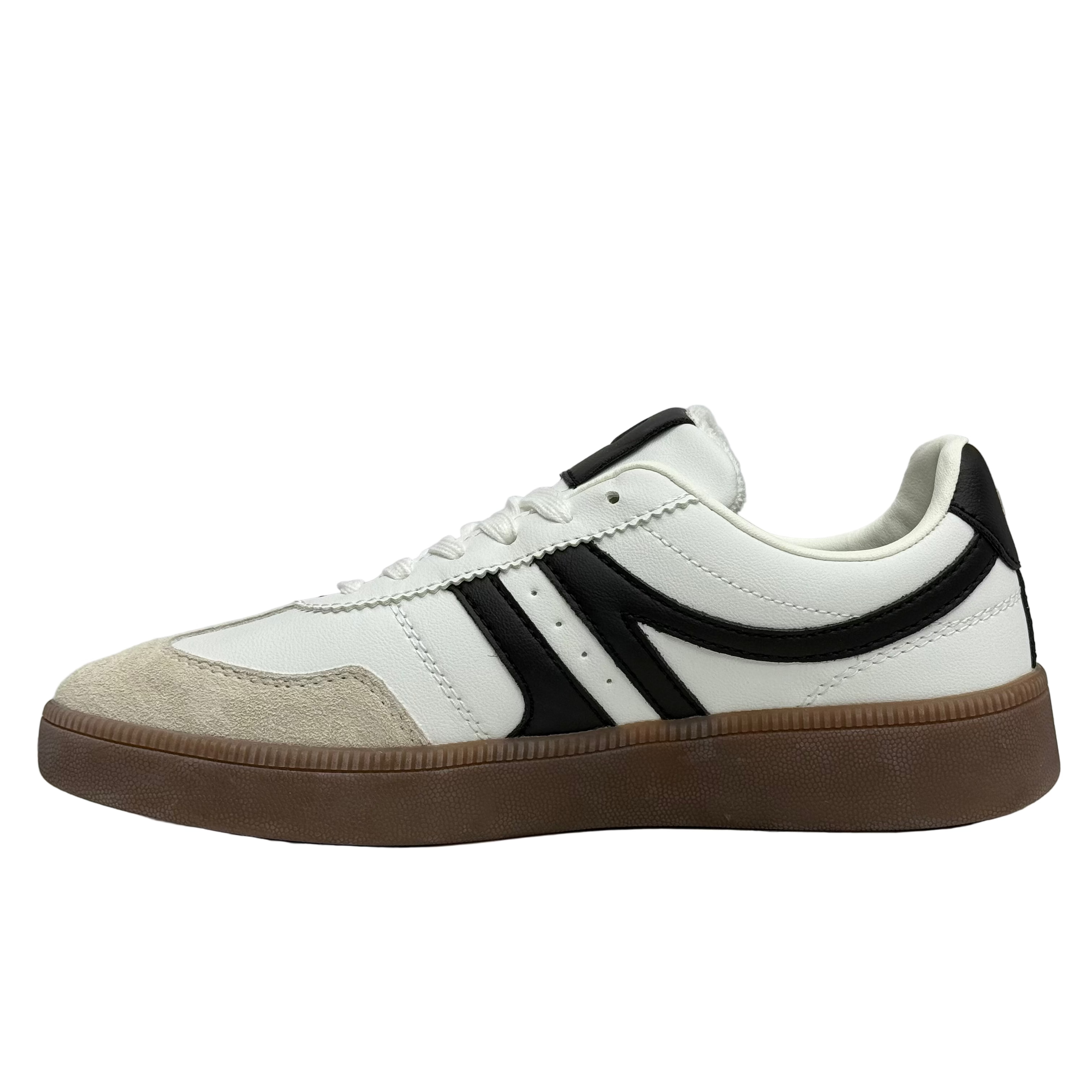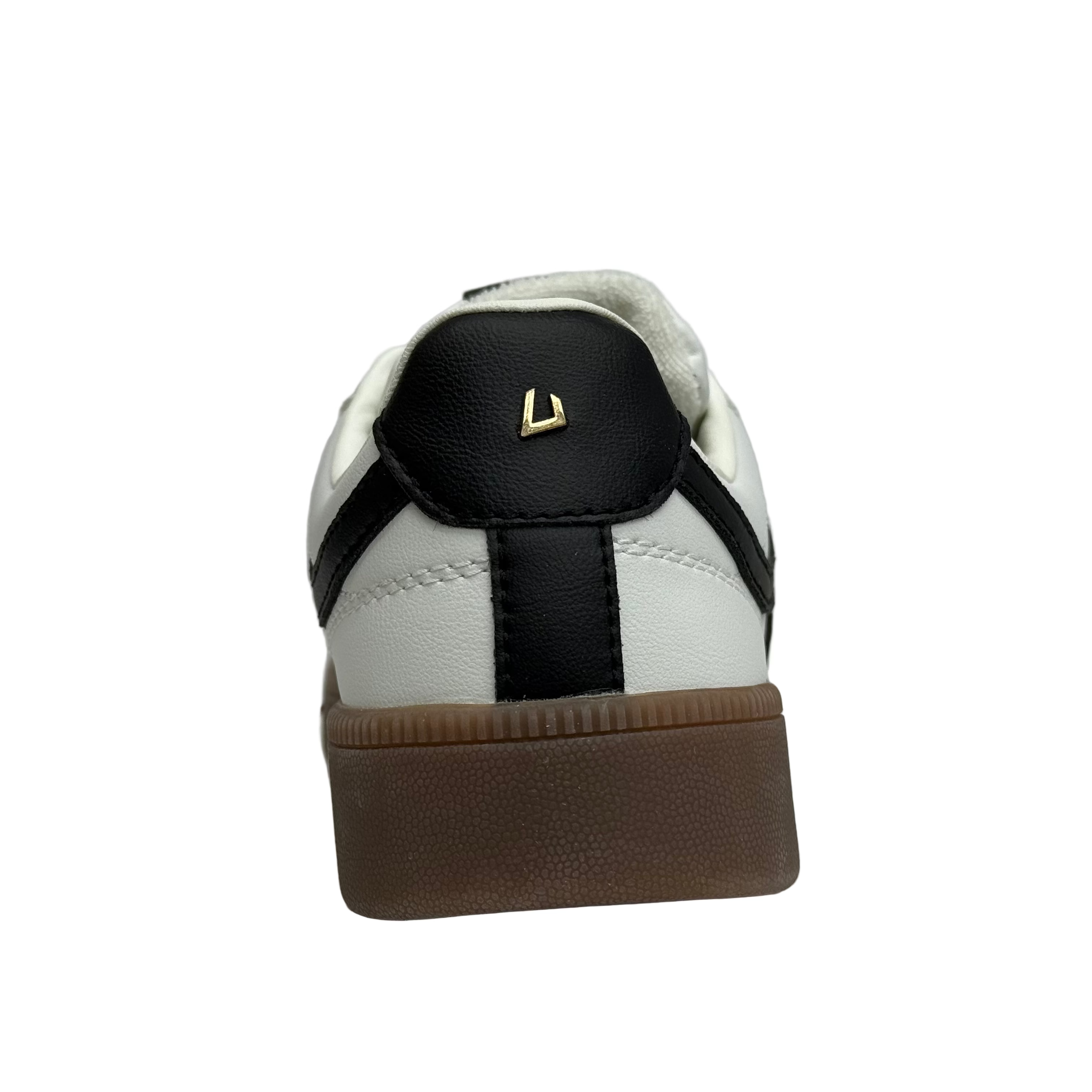 Step out in style with Una Healy Womens Sweet Smile Trainers in white faux leather, accented by beige faux suede and sleek black faux leather trims. Featuring a fun low gum sole and classic lace-up design, these trainers add a smile to every step!